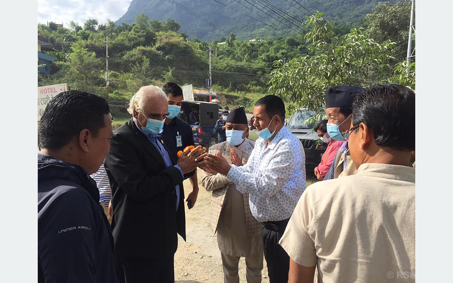 -4 तनहुँ । तनहुँको व्यास नगरपालिका–५ चापाघाटमा आइतबार बिहान गण्डकी प्रदेशका मुख्यमन्त्री कृष्णचन्द्र नेपाली पोखरेललाई स्वागत गर्दै काङ्ग्रेस कार्यकर्ता । तस्वीर/रासस