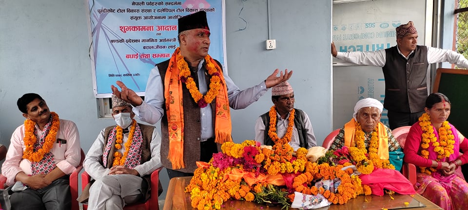 ढलेपिपल टोल विकास संस्थाका अध्यक्ष नवराज बरालको अध्यक्षतामा सम्पन्न भएको कार्यक्रममा माओबादी केन्द्र पोखरा २२ वडा कमिटिका अध्यक्ष चण्डकीका प्रसाद बराल, पुम्दीकोट युवा क्लवका सहसचिव पवन बि.क., पुम्दीकोट टोल विकास संस्थाका अध्यक्ष नरहरी बराल, सचिव राजु बराल लगायतले वोलेका थिए । मन्त्री सहित उनकी आमा धनरुपा बराल र धर्मपत्नी सिता बराललाई समेत कार्यक्रममा फुल माला लगायर सम्मान गरिएको थियो । स्थानिय आमा समुह, क्लव, टोल विकास संस्थाका प्रतिनिधि र स्थानियले मन्त्री बराललाई आफ्नो गााउँमा अर्थ मन्त्री पाउदा निकै गौरव लागेको भन्दै खादा तथा माला लगायर भब्य स्वागत तथा सम्मान गरेका थिए ।