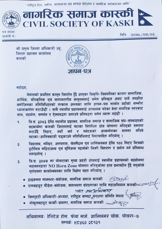 गन्थन संवाददाता, पाेखरा । कास्की जिल्ला पटका निशेधित क्षेत्र भएकाले चाडबाडका नाममा पटका/आतिसबाजी पड्काउने गतिविधिलाई रोक्न जिल्ला प्रशासन कार्यालय कास्कीसँग यहाँका नागरिक अगुवाहरुले माग गरेका छन् । प्रमुख जिल्ला अधिकारी जयनारायण आचार्यलाई बुधबार ३ बुँदे ज्ञापनपत्र बुझाउँदै उनीहरुले उक्त माग गरेका हुन् ।