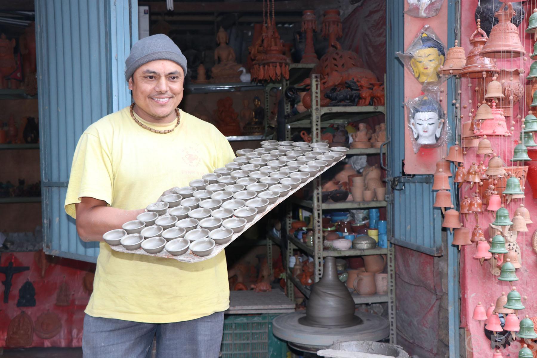 भक्तपुर । तिहारका लागि बनाईएका पाला लगायतका माटोका भाँडा बेच्न बजार लैजान मिलाउँदै भक्तपुर पोटरी स्क्वायरका प्रजापतिहरु । तिहारमा बेच्नका लागि पाला बनाएर घाममा सुकाउन लैजादै पोटरी स्क्वायरका बिनोद प्रजापति । तिहारलाई आवश्यक घैँटो बनाउदै पोटरी स्क्वायरका एक प्रजापति ।
