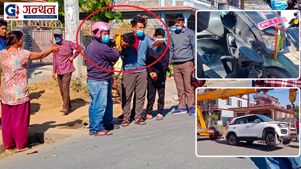 स्कुटर चालक सागर आचार्य गम्भीर घाइते भएका छन् भने कार चालक सुरज बराल सामान्य घाइते भएका छन् । स्कुटर चालक आचार्यलाई मेट्रोसिटी अस्पतालमा उपचारका लागि लगिएको छ ।