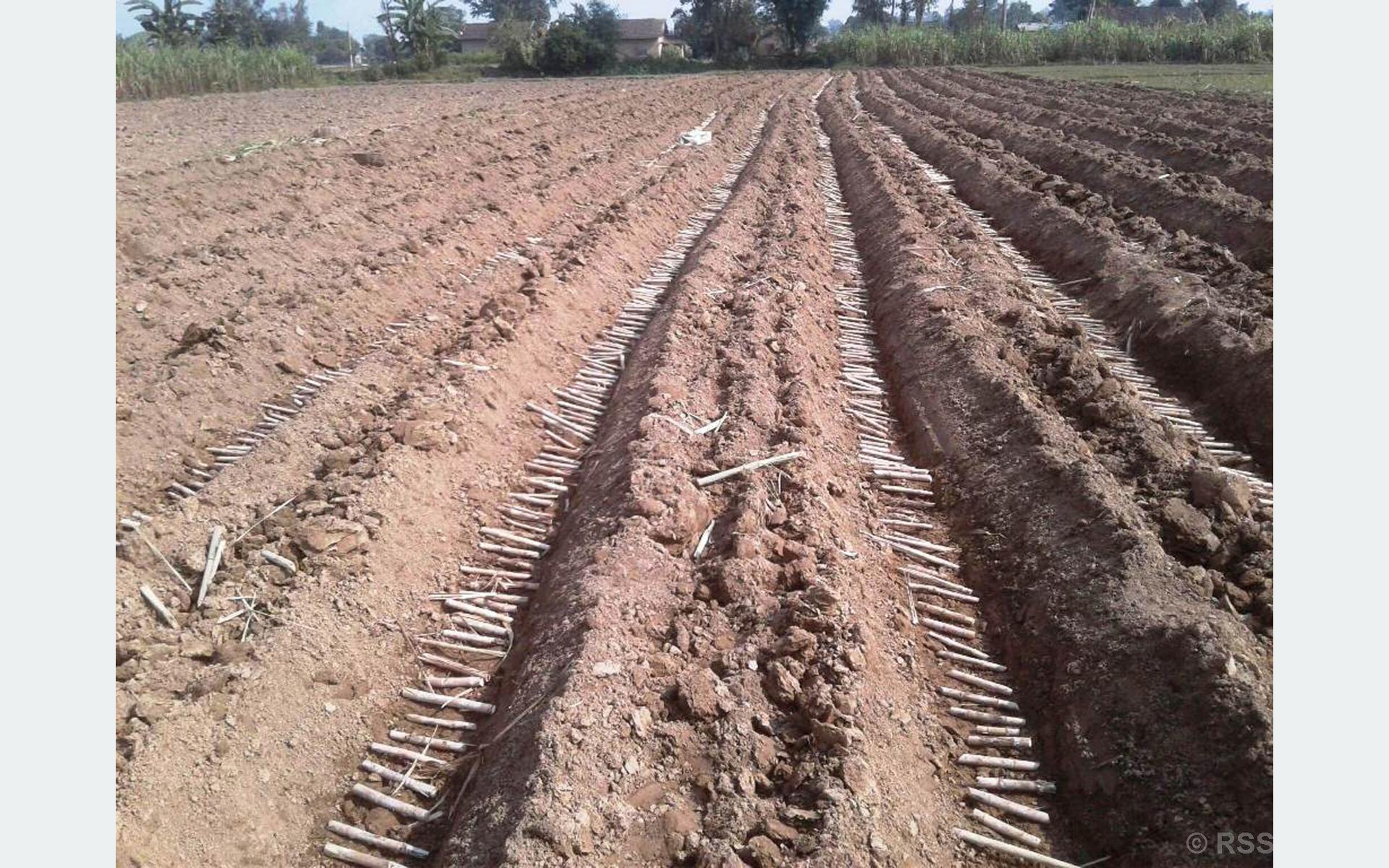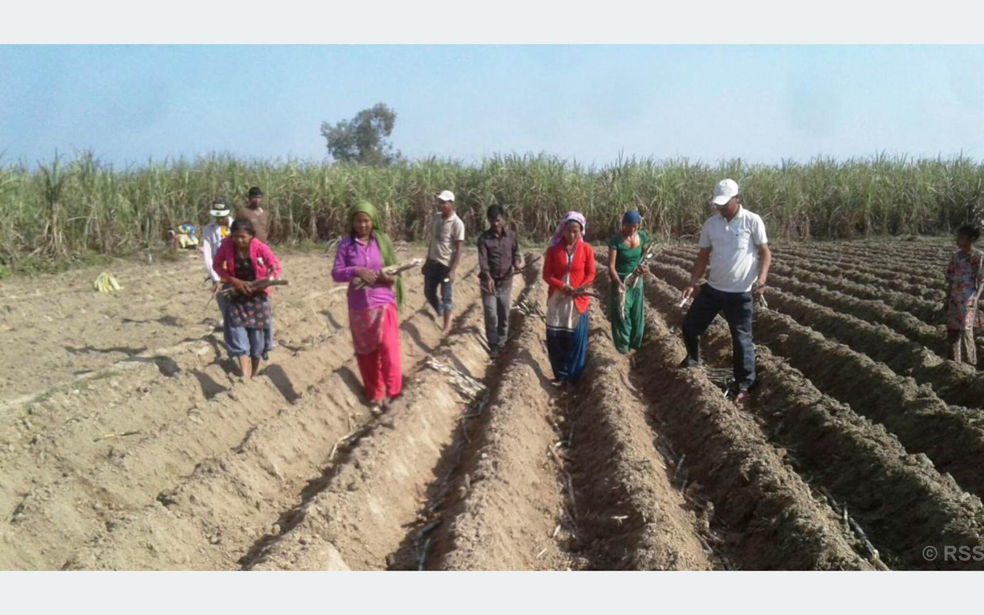 -1 कञ्चनपुर । कञ्चनपुरशुक्लाफाँटा नगरपालिका १२ तिल्कीका किसानले ट्रन्च प्रविधिबाट उखु रोपेका छन् । तस्वीर: रासस/राजेन्द्र् प्रसाद पनेरु
