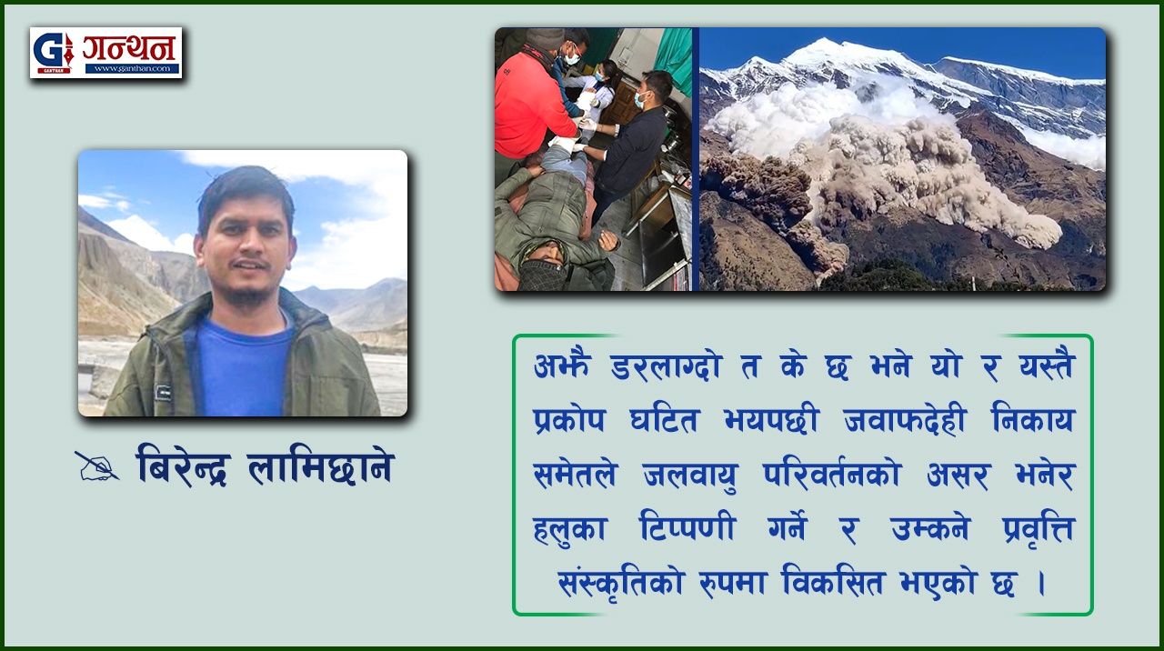 यस सन्दर्भलाई थप प्रस्ट गर्न म आफैले प्रत्यक्ष भोगेको कार्तिक २८ को हिउँपहिरो को घटना स्मरण गराउन सान्दर्भिक ठानेको छु । थासाङ-२ को हिउँ पहिरोको सम्वन्धमा न कुनै आधिकारिक निकायबाट पुर्व सुचना प्राप्त भयो न पहिरो पश्चात जोखिमको मुल्याङ्कन गर्न कुनै विशेषज्ञ टोलिको उपस्थिति नै भएको छ।पहिरो आएको समयमा रुँदै कराउँदै कालिगन्डकी बगरमा भागदौड गरेका स्थानीयहरु अब त पहिरो आँउदैन होला भन्ने मनोविज्ञानले घरभित्र त गएका छन् तर यो त्रासदीले सबैको मनमा छेडिदिएको घाउ लामो समयसम्म निको नहुने निश्चित छ।यसरी नै बॉच्नुपरेको छ हिमालका बस्तिहरु ।
