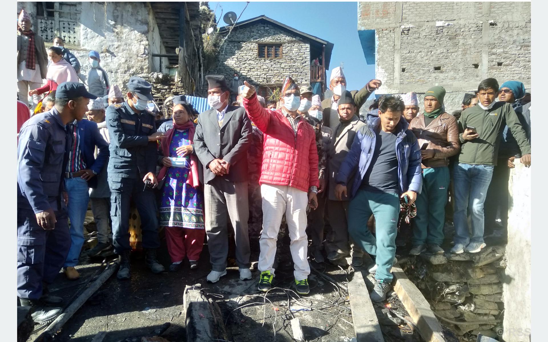 मुगु । सदरमुकाम गमगढीस्थित तल्लो बजारमा बुधबार अग्निपीडितलाई राहत लिएर आएका कर्णाली प्रदेशका मुख्यमन्त्री जीवनबहादुर शाहीसँग दुखेसो पोख्दै अग्निपीडित । मुख्यमन्त्री शाहीले आगलागीबाट भएको क्षतिबारे जानकारी लिएका थिए । सोमबार राति भएको आगलागीबाट मुगुको सदरमुकाम गमगढीको तल्लो बजारमा २१ घर जल्दा घरधनी, बहाल र व्यवसायी गरी ७६ परिवार विस्थापित भएका छन् ।