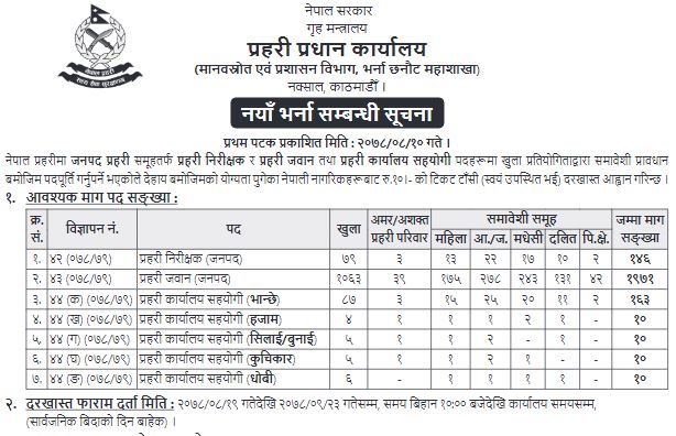 प्रहरीले लोकसेवाको सहमतिमा आज गोरखापत्रमा सूचना जारी गर्दै धोबी, कुचिकार, सिलाइ/बुनाइ, हजाम, भान्छे, प्रहरी जवान र प्रहरी निरीक्षकका लागि २ हजार ३२० जना माग गरेको हो । जसमा सबैभन्दा बढी प्रहरी जवानका लागि १ हजार ९७१ कोटा छ । प्रहरी जवानमा १ जार ६३ खुलातर्फ पदपूर्ति हुनेछ, भने बाँकी सिट समावेशी समूहका लागि छुट्याइएको छ ।
