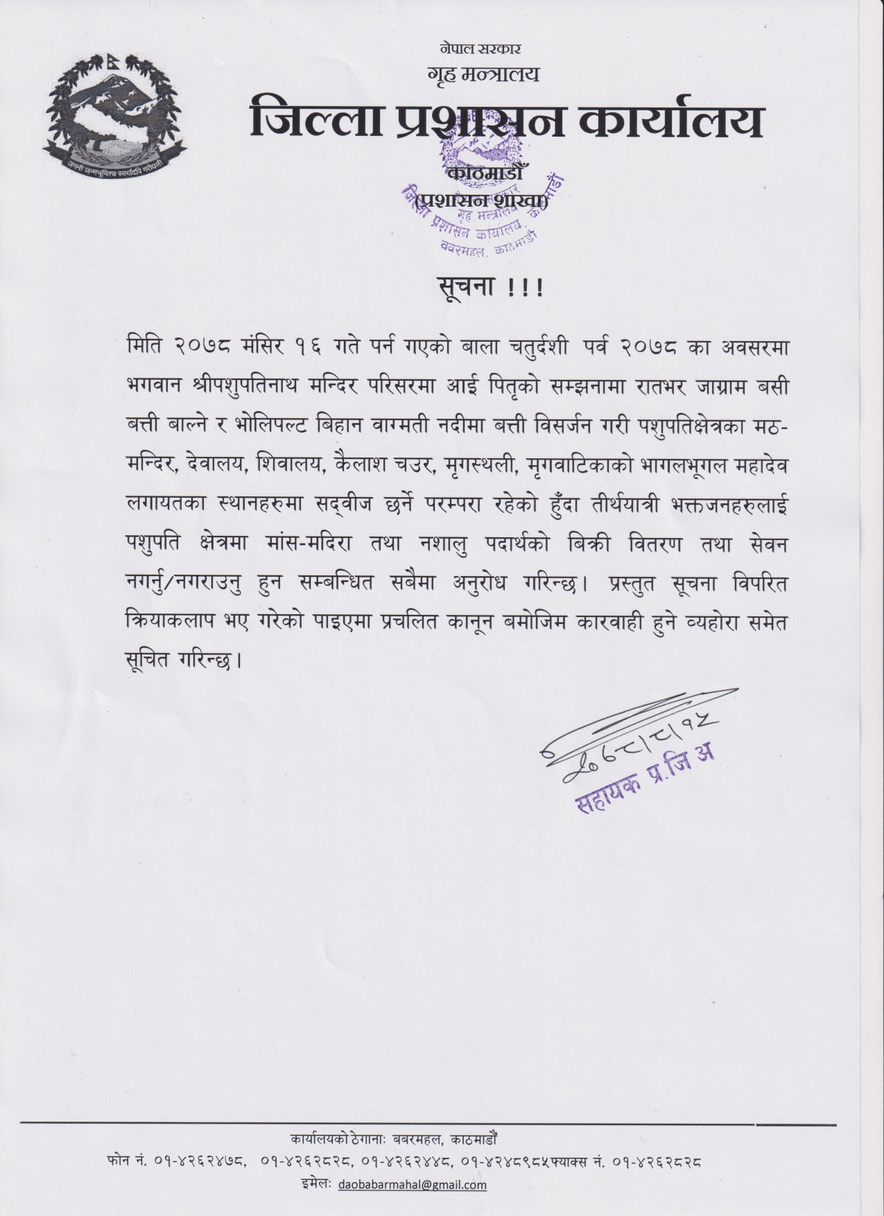 सहायक प्रमुख जिल्ला अधिकारीले बुधबार सूचना जारी गरेर भोलि १६ मंसिरमा पर्ने बाला चतुर्दशी पर्वका दिन पशुपतिनाथ मन्दिर परिसरमा पितृको सम्झनामा रातभर जाग्राम बसी बत्ती बाल्ने कार्यक्रम रहेको जानकारी गराउँदै मन्दिर परिसरमा मांस–मदिरा तथा नशालु पदार्थको बिक्री–वितरण तथा सेवन नगर्नरनगराउन अनुरोध गरेका हुन् ।