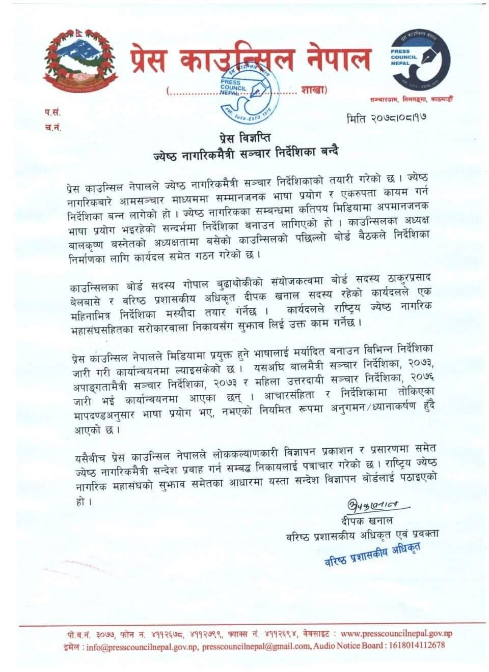 प्रेस काउन्सिल नेपालले ज्येष्ठ नागरिकमैत्री सञ्चार निर्देशिकाको तयारी गरेको छ । ज्येष्ठ नागरिकबारे आमसञ्चार माध्यममा सम्मानजनक भाषा प्रयोग र एकरुपता कायम गर्न निर्देशिका बन्न लागेको हो। ज्येष्ठ नागरिकका सम्बन्धमा कतिपय मिडियामा अपमानजनक भाषा प्रयोग भइरहेको सन्दर्भमा निर्देशिका बनाउन लागिएको हो । काउन्सिलका अध्यक्ष बालकृष्ण बस्नेतको अध्यक्षतामा बसेको काउन्सिलको पछिल्लो बोर्ड बैठकले निर्देशिका निर्माणका लागि कार्यदल समेत गठन गरेको छ ।