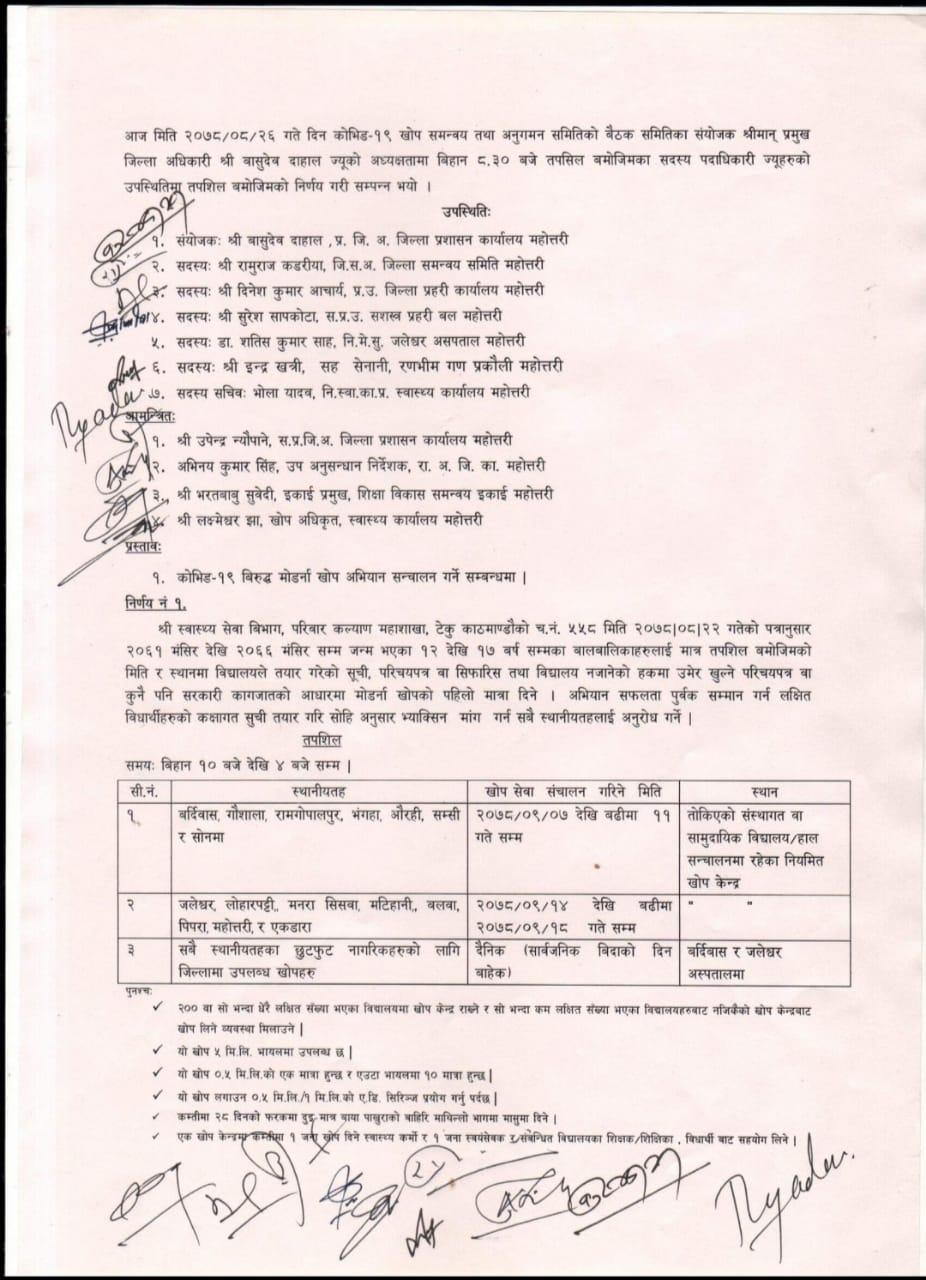 जिल्ला स्वास्थ्य कार्यालयका प्रमुख भोला यादवका अनुसार सामुदायिक विद्यालयमै पुगेर विद्यार्थीलाई खोप लगाउनेछ । त्यसका लागि माेर्डना खाेप आइसकेकाे उनले जनाए ।