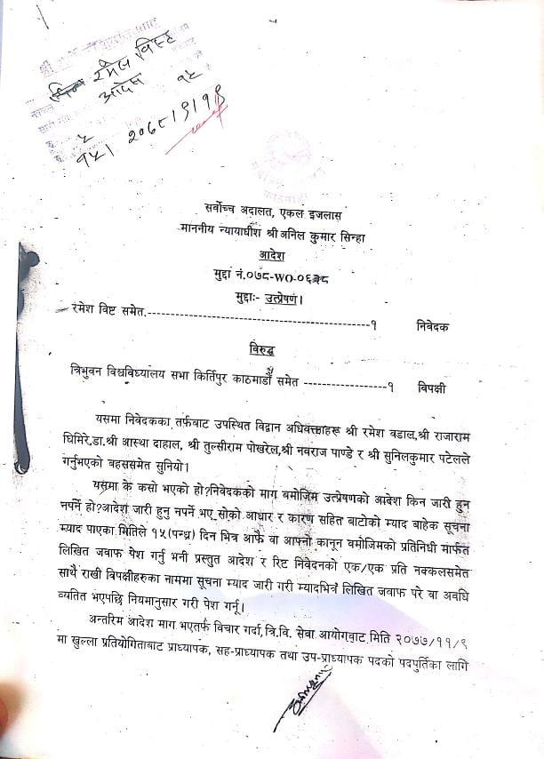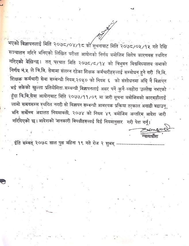 ‘त्रिवि सेवा आयोगबाट मिति २०७७/११/९ मा खुला प्रतियोगिताबाट प्राध्यापक सह-प्राध्यापक तथा उप-प्राध्यापक पदको पदपूर्तिका लागि भएको विज्ञापनलाई मिति २०७८/०४/१८ को सूचनाबाट २०७८/०५/१५ गतेदेखि सञ्चार गरिने भनिएको लिखित परीक्षा आयोगको निर्णय बमोजिम विशेष कारणबस स्थगित गरिएको देखिन्छ,’ आदेशमा भनिएको छ, ‘८/१४ को त्रिवि सभाको निर्णय नं ५ ले त्रिवि सेवामा संलग्न रहेका शिक्षक कर्मचारीहरुलाई सम्बोधन हुने गरी त्रिवि शिक्षक कर्मचारी सेवा सम्बन्धी नियम २०५० को नियम ६ संशोधनमा अधि नै विज्ञापन भइ सकेको खुला प्रतियोगिता सम्बन्धी विज्ञापनलाई असर पर्ने कुनै व्यहोरा उल्लेख नभएको हुँदा त्रिवि सेवा आयोगबाट २०७७/११/०९ मा जारी सूचना बमोजिमको कारबाहीलाई लामो समयसम्म स्थगित नगरी सो विज्ञापन सम्बन्धी आवश्यक प्रक्रिया तत्काल अगाडि बढाउ भनि सर्वोच्च अदालतको नियमावली, २०७४ को नियम ४९ बमोजिम अन्तरिम आदेश जारी गरिदिएको छ ।’