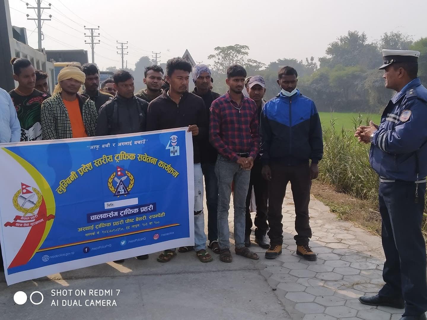 लुम्बिनी प्रदेश ट्राफिक प्रहरी कार्यालयको पहलमा र जिल्ला ट्राफिक प्रहरी कार्यालयको समन्वयमा लुम्बिनी प्रदेश स्तरीय सचेतना कार्यक्रम अन्तर्गत चालकसँग ट्राफिक प्रहरी अभियान विगत एक महिनादेखि संचालनमा छ । महिनाको चार साता फरक फरक कार्यक्रम भइरहेको छ । जसअन्तर्गत पहिलो साता मोटरसाइकल, दोस्रो साता हलुका सवारीसाधन तेस्रो साता ठूला सवारीसाधन र चौथो साता साइकल, रिक्सालगायतका सवारी साधनहरूलाई दुर्घटनाबाट बच्ने उपाय, सडक प्रयोग गर्दा अपनाउनु पर्ने सावधानी, ओभरटेक कसरी गर्ने भनेर सिकाउने, लेनसम्बन्धी प्रशिक्षण भइरहेको प्रमुख केसीले बताए ।