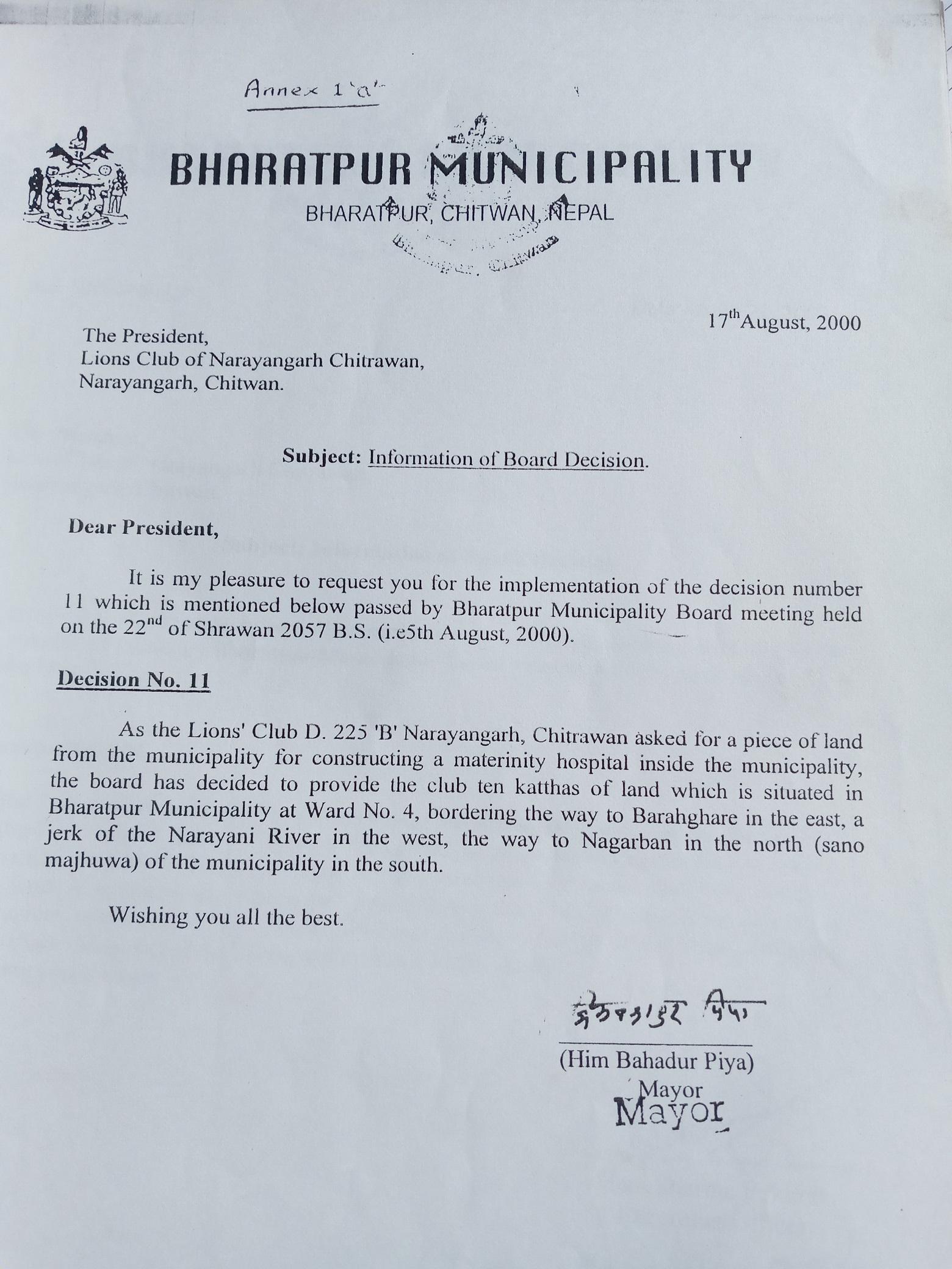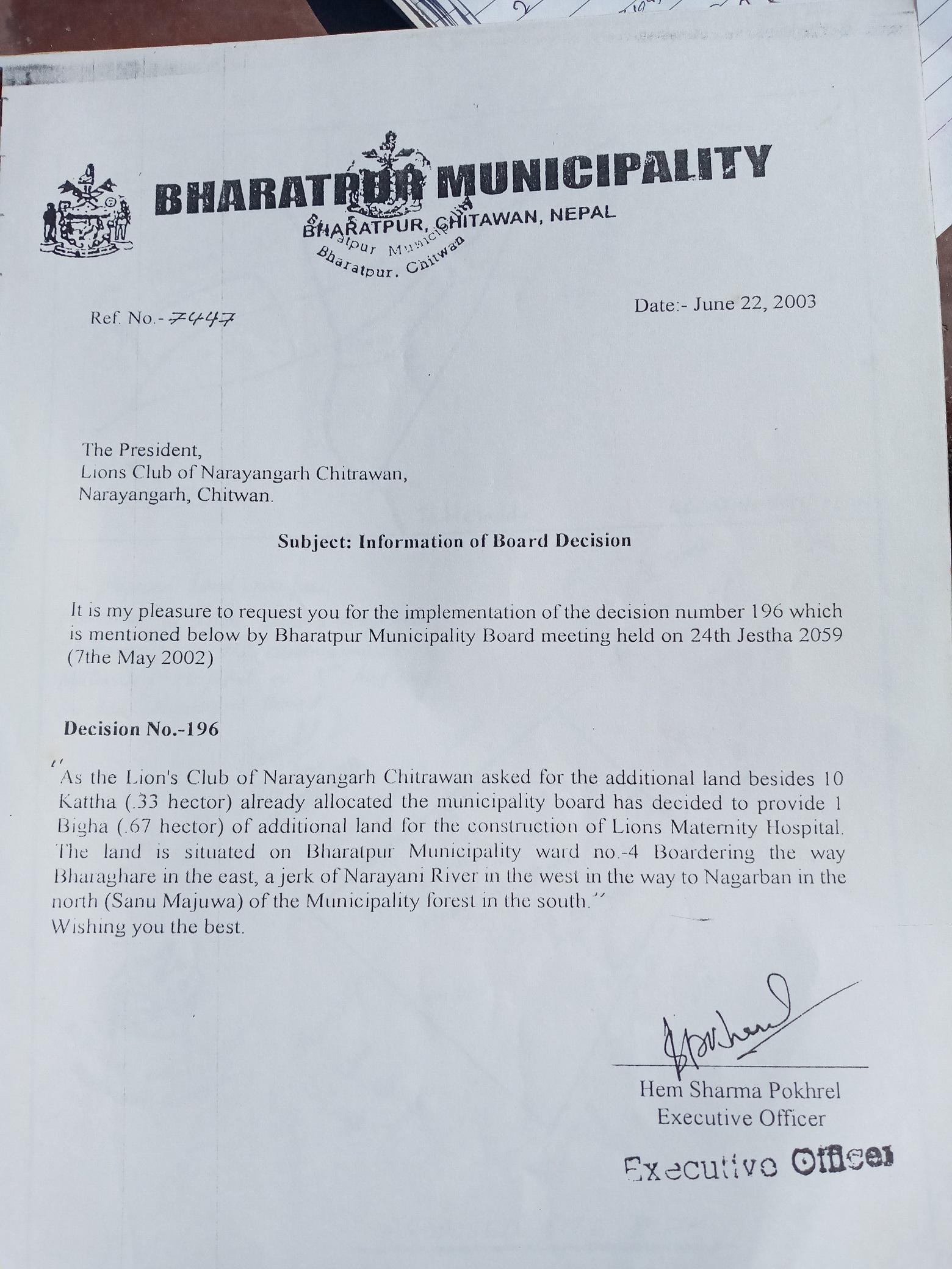 लायन्स प्रसूति गृह निर्माणको लागि लायन्स क्लब अफ नारायणगढ चित्रवनले तत्कालीन भरतपुर नगरपालिकासँग जग्गा माग गरेको थियो । नगरपालिकाको २२ साउ २०५७ को बोर्ड बैठकले क्लबलाई प्रसूति गृह बनाउन नगरवनको १० कठ्ठा जग्गा दिने निर्णय गरेको हो ।