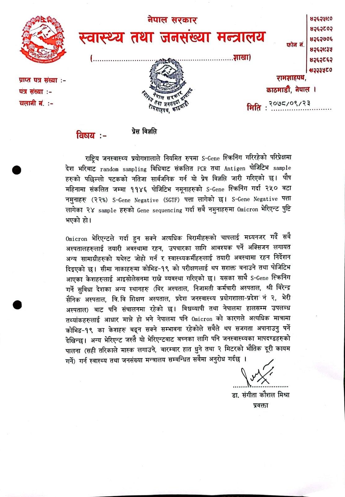 ‘पुस महिनामा संकलित जम्मा कोरोनाभाइरसका ११४६ पोजेटिभ नमुनाहरुको एस जिन स्क्रिनिङ गर्दा २५० वटामा नमुनाहरु एस जिन नेगेटिभ पत्ता लागेको छ । एस जिन नेगेटिभ पत्ता लागेकामध्ये २४ वटामा नमुनाहरुको जिन सिक्वेन्सिङ गर्दा सबै नमुनाहरुमा ओमिक्रोन भेरियन्ट संक्रमण पुष्टि भएको हो,’ मन्त्रालयकी प्रवक्ता डा. संगीता मिश्राले जारी गरेको विज्ञप्तिमा उल्लेख छ ।
