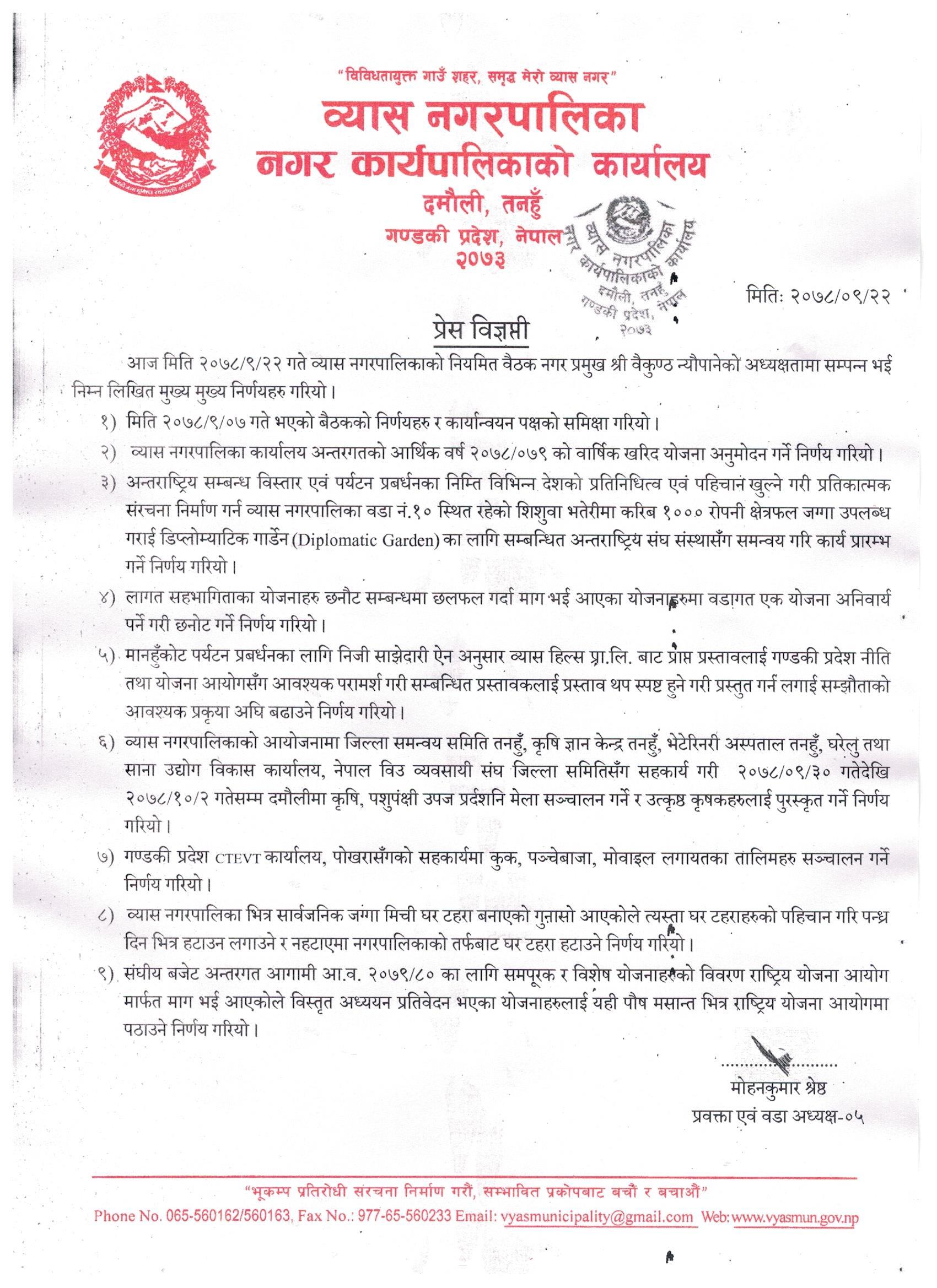 तनहुँ l तनहुँको व्यास नगरपालिकाको बिहीबार बसेको कार्यपालिका बैठकको निर्णय सार्वजनिक भएसँगै जिल्लामा तरङ्ग पैदा भएको छ । कार्यपालिका बैठकको निर्णय सार्वजनिक गर्न जारी प्रेस विज्ञप्तिको पाँचौँ बुँदाले तरङ्ग पैदा गराएको हो ।