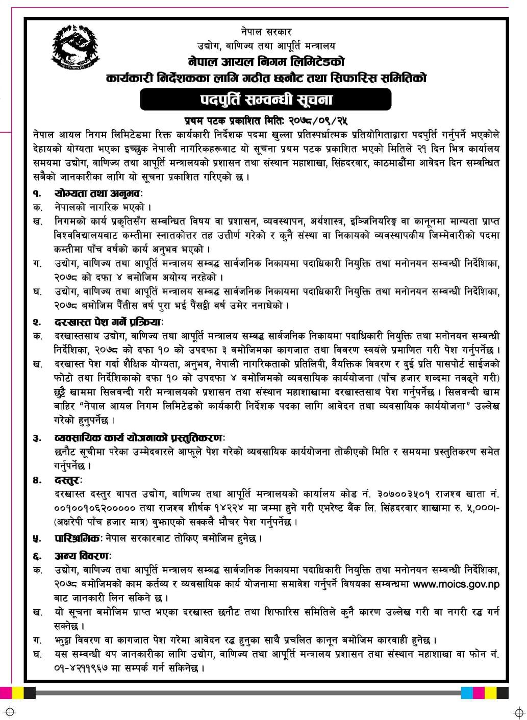 कार्यकारी निर्देशक छनोट तथा सिफारिस समितिले आइतबार सूचना जारी गर्दै आवेदन खुला गरेको हो । पौडेल २०७५ सालमा कार्यकारी निर्देशकमा नियुक्त भएका थिए । उनी २२ पुसमा निगमबाट बिदाइ भएका थिए ।