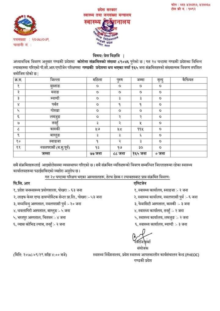 त्यस्तै गण्डकी प्रदेशभित्रका जिल्ला म्याग्दीमा ३, पर्वतमा १, लमजुङमा २, तनहुँमा ५, बागलुङमा ६, स्याङ्जामा ३ र नवलपुरमा ३० जनामा संक्रमण पुष्टि भएको स्वास्थ्य निर्देशनालय गण्डकी प्रदेशले जनाएको छ । आजमात्रै गण्डकी प्रदेशमा कुल १ सय ६५ जनामा संक्रमण पुष्टि भएको छ ।