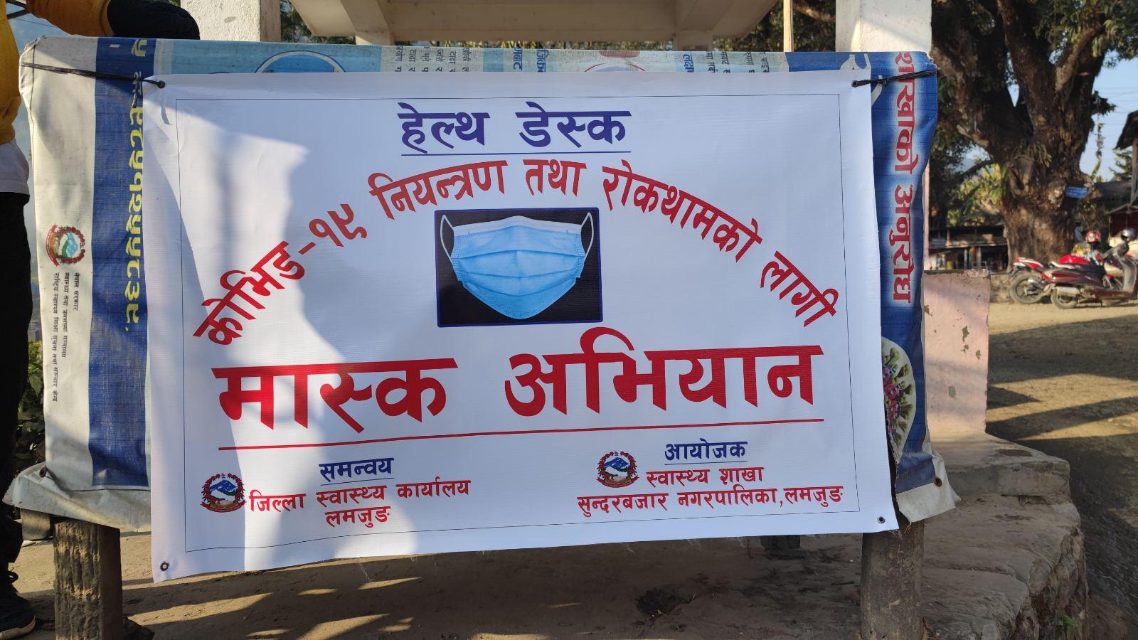 सुन्दरबजार नगरपालिका र जिल्ला स्वास्थ्य कार्यालयको समन्वय र जिल्ला प्रहरी कार्यालयको सहयोगमा पाउँदी नाकामा हेल्थ डेक्स स्थापना गरी सचेतना सहितको माक्स अभियान सञ्चालन गरिएको हो । माक्स लगाउँदा मात्र पनि कोभिड संक्रमण फैलिनबाट जाेगिने भन्दै अभियानमा साथ दिन प्रहरीले आग्रह गरेको छ ।