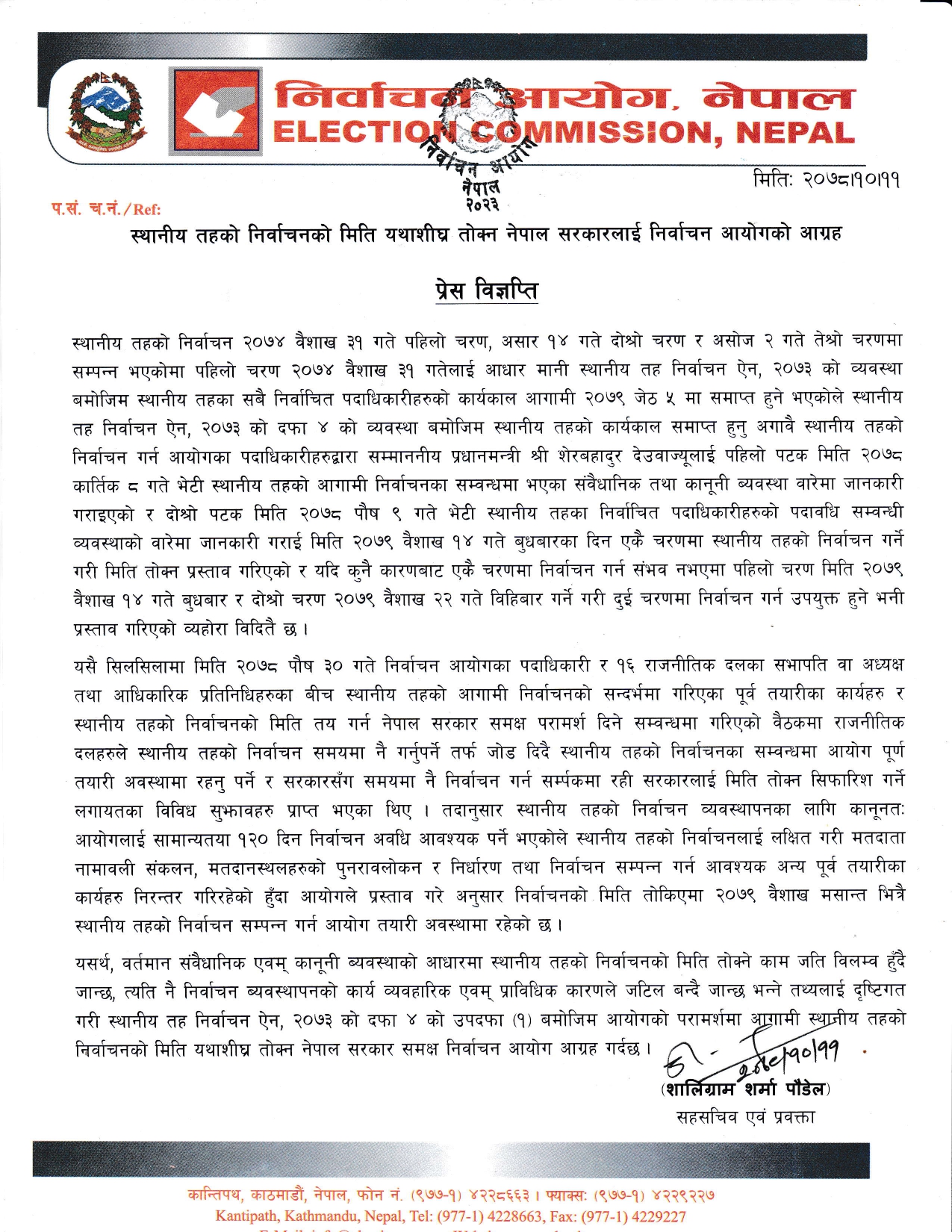यसर्थ, वर्तमान संवैधानिक एवम् कानूनी ब्यवस्थाको आधारमा स्थानीय तहको निर्वाचनको मिति तोक्ने काम जति विलम्व हुँदै जान्छ, त्यति नै निर्वाचन ब्यवस्थापनको कार्य व्यवहारिक एवम् प्राविधिक कारणले जटिल बन्दै जान्छ भन्ने तथ्यलाई दृष्टिगत गरी स्थानीय तह निर्वाचन ऐन, २०७३ को दफा ४ को उपदफा (१) बमोजिम आयोगको परामर्शमा आगामी स्थानीय तहको निर्वाचनको मिति यथाशीघ्र तोक्न नेपाल सरकार समक्ष निर्वाचन आयोग आग्रह गर्दछ ।