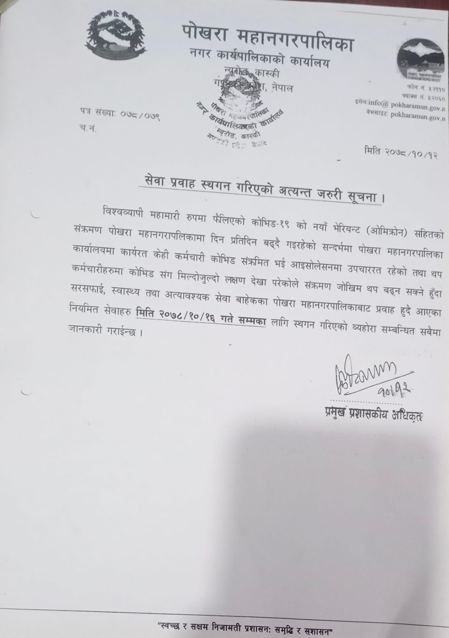 गन्थन संवाददाता, पोखरा । कोभिड १९ को नयाँ भेरियन्ट ओमिक्रोनसहितको संक्रमण पोखरा महानगरपालिकाका कर्मचारीमा देखिएपछि महानगरपालिकाबाट प्रवाह हुदै आएका अत्यावश्यक बाहेक नियमित सेवाहरु स्थगित गरिएको छ । महानगरपालिकाले आज विज्ञप्तीमार्फत कर्मचारीमा संक्रमणको कारण देखाउँदै माघ १६ गतेसम्मका लागि नियमित सेवा स्थगित गरिएको जानकारी दिएको हो ।