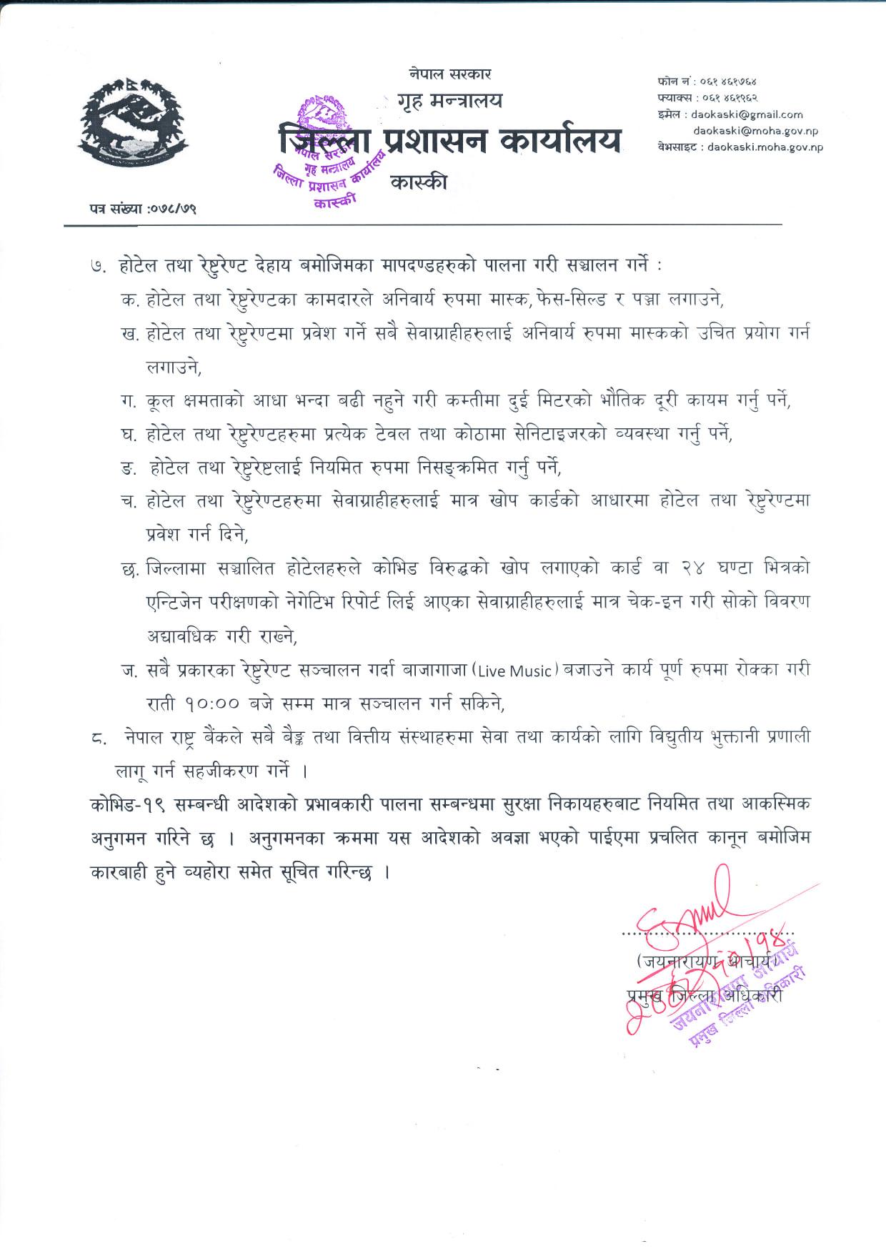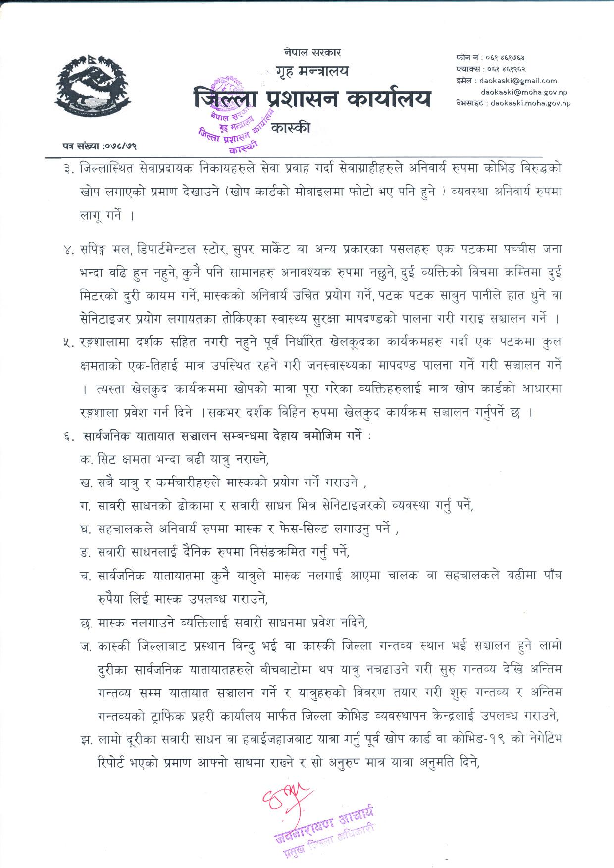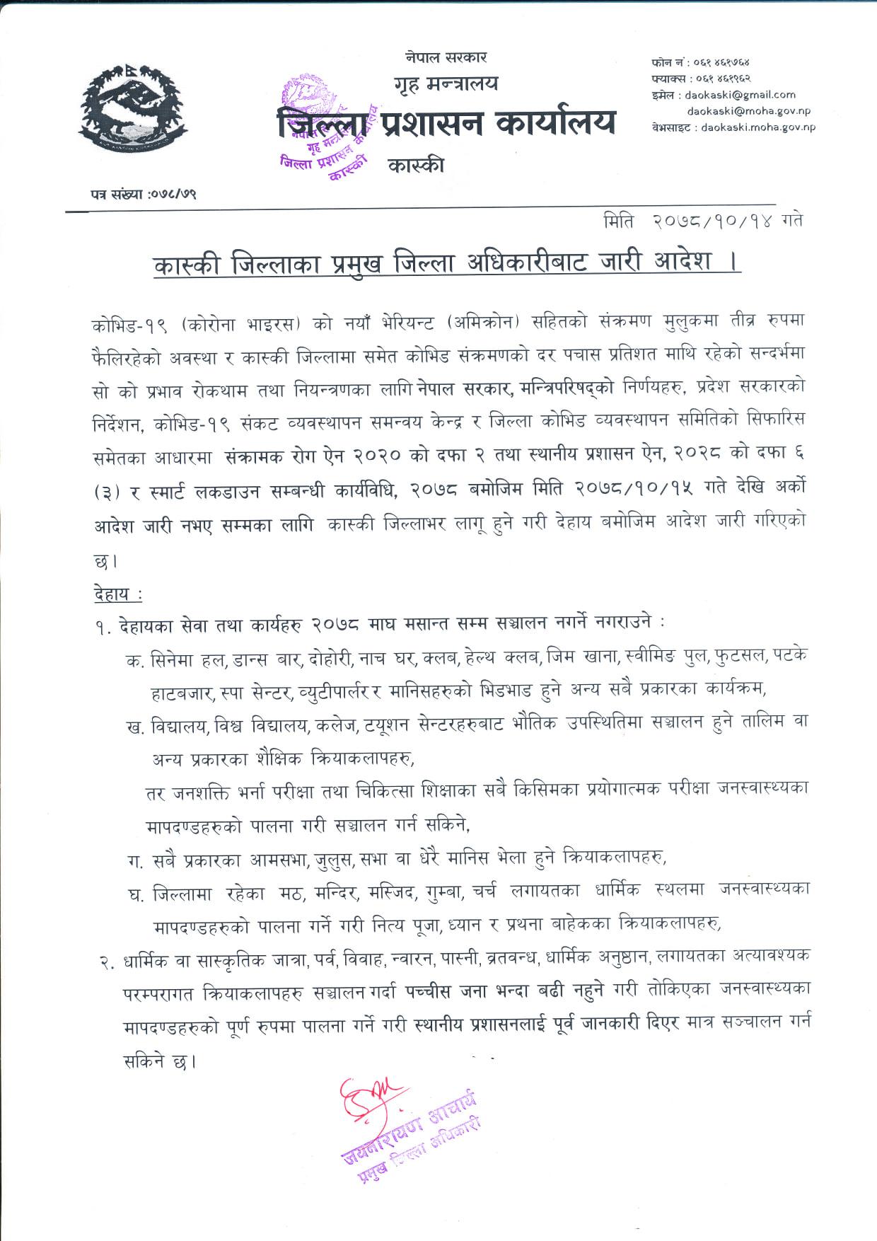 गन्थन संवाददाता, पोखरा । जिल्ला प्रशासन कार्यालय कास्कीबाट एक सूचना जारी गरि स्मार्ट लकडाउन लम्बाइएको छ । जसमा माघ मसान्तसम्म सिनेमा हल, डान्स बार, दोहोरी, नाँच घर, क्लब, हेल्थ क्लब, जिमखाना, स्वीमिङ पुल, फुटसल, पटके, हाटबजार, स्पा सेन्टर, ब्युटीपार्लर र मानिसहरुको भिडभाड हुने कुनै पनि व्यवसाय सञ्चालन गर्न नपाउने आदेश प्रशासनले जारी गरेको छ ।