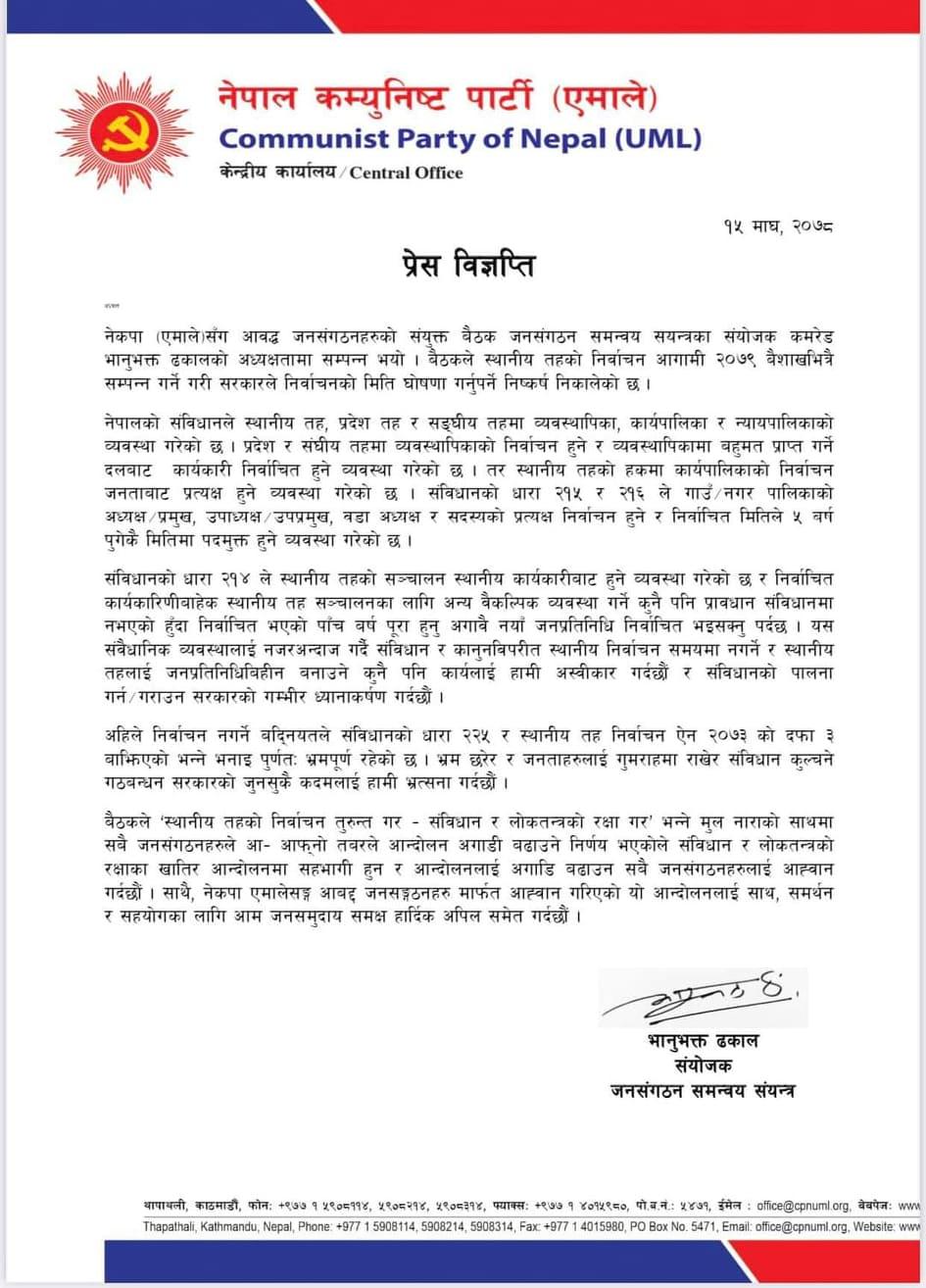 ‘संविधानको धारा २१५ र २१६ ले गाउँ/नगर पालिकाको अध्यक्ष/प्रमुख, उपाध्यक्ष/उपप्रमुख, वडा अध्यक्ष र सदस्यको प्रत्यक्ष निर्वाचन हुने र निर्वाचित मितिले ५ वर्ष पुगेकै मितिमा पदमुक्त हुने व्यवस्था गरेको छ,’ संयन्त्रका संयोजक भानुभक्त ढकालले जारी गरेको विज्ञप्तिमा भनिएको छ ।