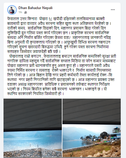 सामाजिक संजालमा निरन्तर प्रश्न उठेपछि प्रवक्ता नेपालीले थप प्रष्ट पार्दै लेखेका छन्,  ‘फेवाताल उत्तर किनारा पोखरा १८ खपौदी दक्षिणको तालसिमानामा ब्यक्ती ब्यवसायीद्वारा वारवार अवैध संरचना सहित खुला स्थल अतिक्रमण भैरहेको छ । रातीको समय, सार्वजनिक विदाको दिन, महानगर प्रशासन बिदा गरेको दिन लुकिछिपी द्रुत गतिमा यस्ता कार्य गरिएका छन । प्राकृतिक संरचना सार्वजनिक सम्पदा अनि निर्माण बर्जित गरिएका छेत्रमा वडा/ महानगरलाइ जानकारी नदिइ बिना अनुमती यी कृयाकलाप गरिएको छ । आफुखुशी विभिन्न संरचना नबनाउन गरिएको सुचना खवरदारी बिरुद्धमा उभिदै हुने गरेका यस्ता संरचना निर्माणमा सलग्नहरु जिम्मेवार जवाफदेही बन्नै पर्छ ।’