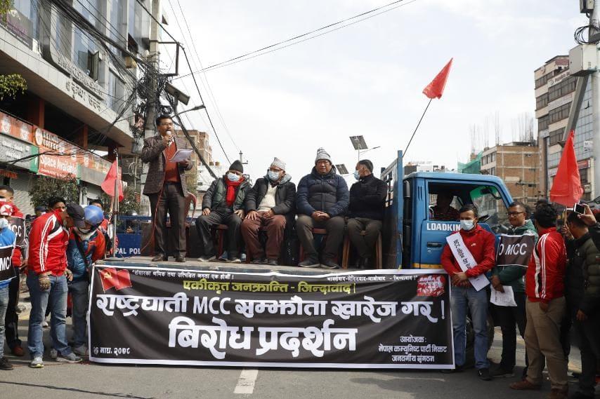 नेकपा (क्रान्तिकारी माओवादी), नेकपा (मसाल) र नेपाल कम्युनिस्ट पार्टीलगायत ६ कम्युनिस्ट पार्टी र २ मोर्चाले एमसीसी सम्झौताविरुद्ध माइतीघर मण्डलासहित देशभर विरोध प्रदर्शन गरेकाे छ । उनीहरूले बानेश्वरस्थित संसद भवन घेराउ समेत गरेका छन् ।