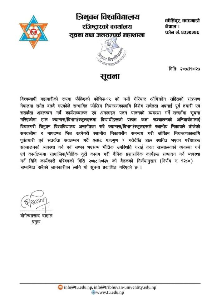 स्थानीय निकायले तोकेको समयसीमा र मापदण्ड भित्र रहनेगरी स्थानीय निकायसँग समन्वय गरी जोखिम नियन्त्रणकालागि पूर्वतयारी एवं सतर्कता अवलम्बन गर्दै स्थगित परीक्षा र एवं सम्भव भएसँगै भौतिक उपस्थितिमा कक्षा सञ्चालन गर्न निर्देशन दिएको हो । त्रिवि कार्यकारी परिषदको माघ २५ गतेको बैठकले यस्तो निर्णय गरेको त्रिविले जनाएको छ ।