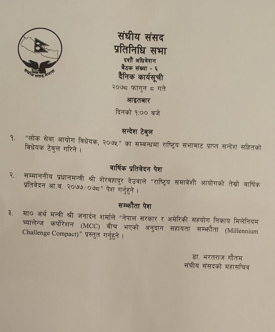 प्रतिनिधिसभा बैठकको सार्वजनिक कार्यसूचीमा एमसीसीलाई समेटिएको छ । कार्यसूचीको तेस्रो बुँदामा एमसीसी प्रस्तुत गर्ने उल्लेख गरिएको छ ।