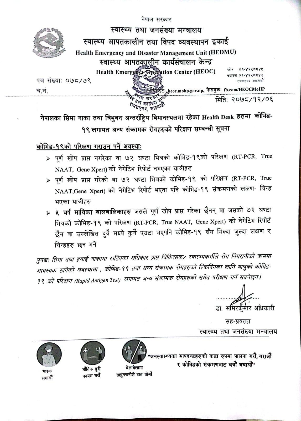 त्यस्तै पूर्णं खोप प्राप्त गरेको वा ७२ घन्टाभित्रको कोभिडको परीक्षणको नेगेटिभ रिपोर्ट भए पनि कोभिड संक्रमणको लक्षण भएका यात्रुहरूको समेत पीसीआर परीक्षण गराउन निर्देशन दिइएको मन्त्रालयका सहप्रवक्ता डा. समिरकुमार अधिकारीले बताए ।