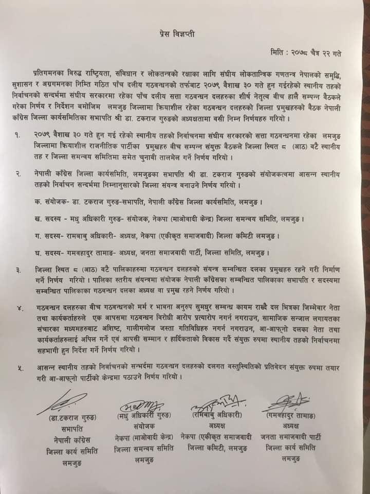 लमजुङ / लमजुङमा आगामी ३० वैशाखमा हुने स्थानीय तहको निर्वाचनमा सत्तारुढ दल नेपाली कांग्रेससहित चार दलको गठबन्धन हुने भएको छ । मंगलबार कांग्रेससहित माओवादी केन्द्र, एकीकृत समाजवादी र जनता समाजवादी पार्टी  जिल्लास्तरीय नेताहरूको बैठकले निर्वाचनमा एक भएर अगाडि बढ्ने निर्णय गरेका हुन् ।