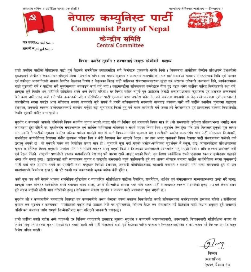 सचिवालय सदस्यको नामबाट वक्तव्य जारी गर्दै पार्टीले स्थानीय चुनावमा पठाएका देशभक्त, जनवादी स्वतन्त्र उम्मेदवारहरूलाई सहयोग गर्नुको सट्टा चुनावबाट फिर्ता हुनुपर्ने, नभए कारबाही गर्ने जस्ता गैरजिम्मेवार एवं हास्यास्पद वक्तव्य दिएको विप्लवको आरोप छ । कारबाहीमा परेका दुवैले नयाँ पार्टी खोल्ने तयारी थालेका छन् ।