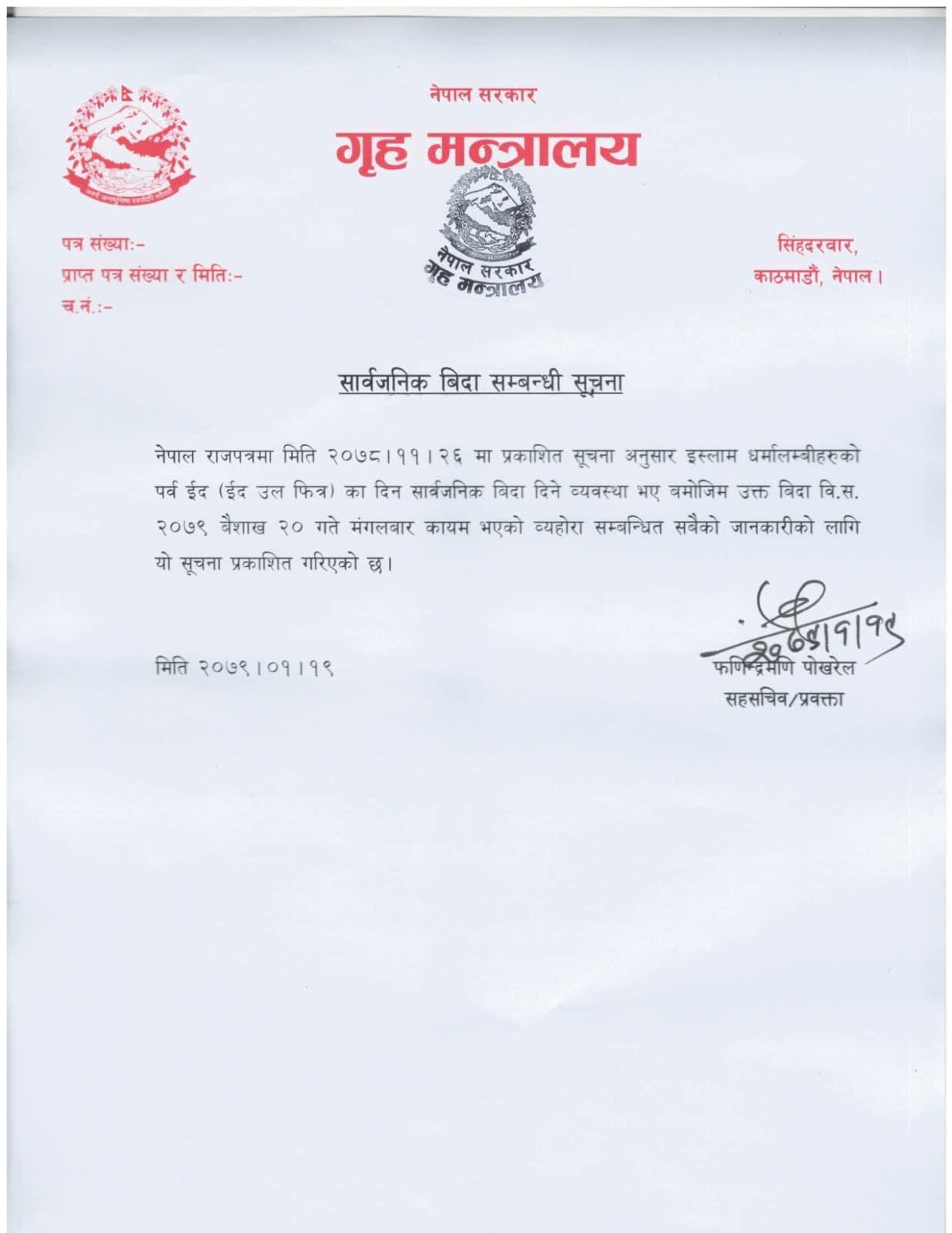 इस्लाम धर्मालम्वीहरुको पर्व ईद (ईद उल फित्र) का अवसरमा २०७९ बैशाख २० गते सार्वजनिक बिदा दिइएको आज गृह मन्त्रालयद्वारा जारी विज्ञप्तीमा उल्लेख गरिएको छ ।