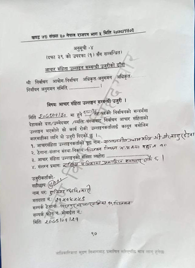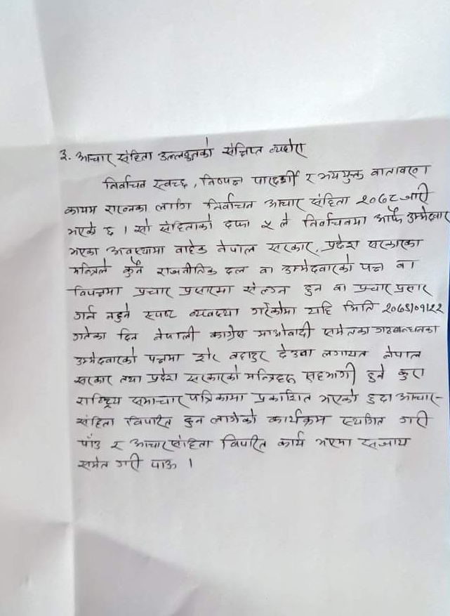 `२२ वैशाखका दिन नेपाली कांग्रेस, माओवादीसमेतका गठबन्धनका उम्मेद्वारको पक्षमा शेरबहादुर देउवालगायत नेपाल सरकार तथा प्रदेश सरकारको मन्त्रीहरू सहभागी हुने कुरा राष्ट्रिय समाचार पत्रिकामा प्रकाशित भएको हुँदा आचारसंहिताविपरीत हुन लागेको कार्यक्रम स्थगित गरी पाउँ र आचारसंहिताविपरीत कार्य भएमा सजाय समेत गरी पाऊँ,’ उजुरीमा भनिएको छ ।
