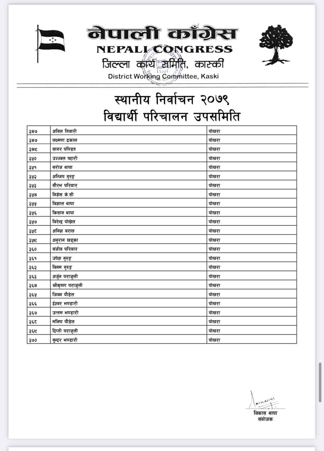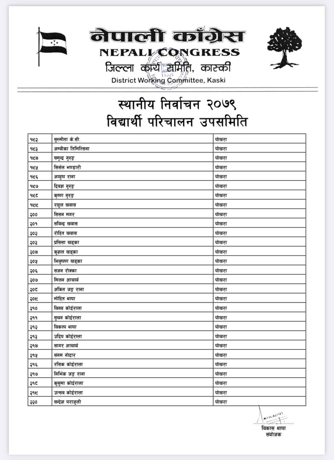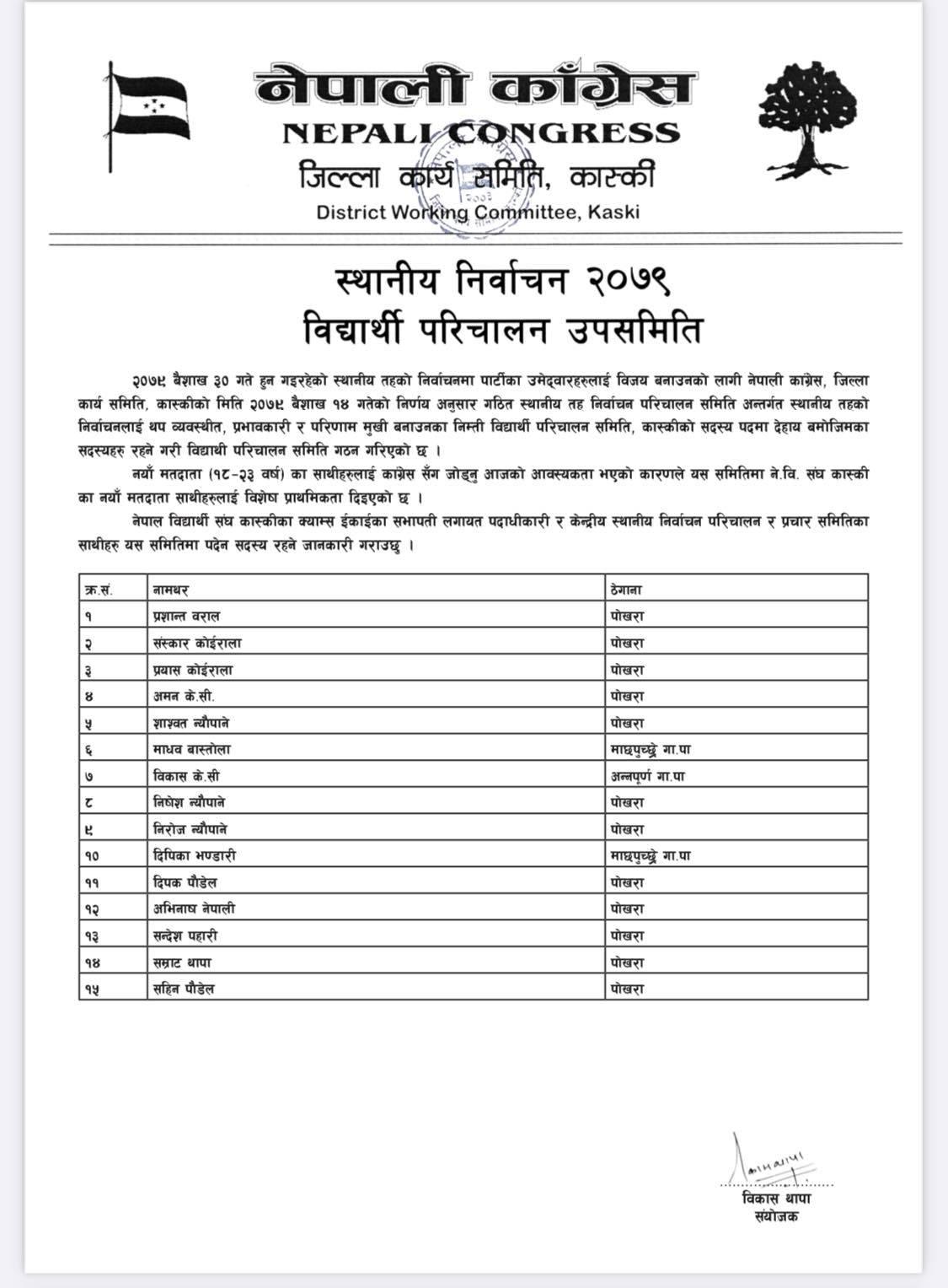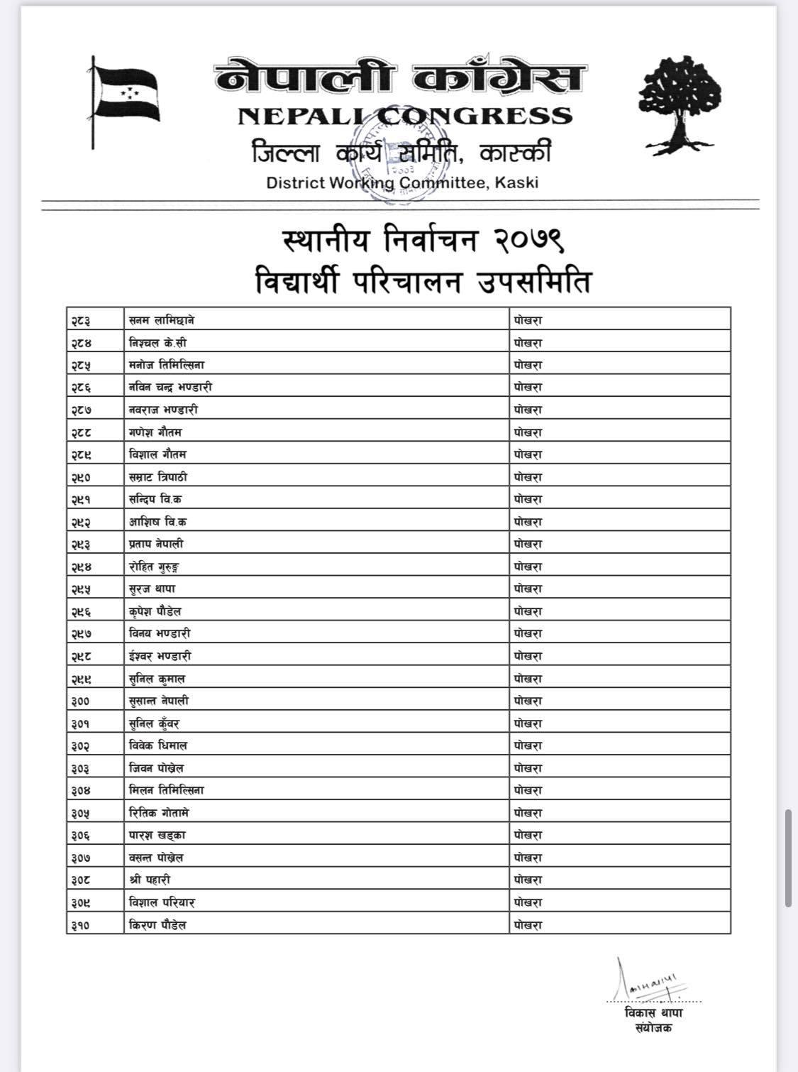 पोखरा/नेपाली काँग्रेसको बिद्यार्थी संगठन नेपाल विद्यार्थी संघले कास्कीको निर्वाचन हाँक्नका लागि ५०८ सदस्यीय निर्वाचन परिचालन समिति गठन गरेको बिद्यार्थी परिचालन समितिका संयोजक बिकास थापाले जानकारी दिए । थापाले नेपाली काँग्रेस र गठबन्धनका उम्मेदवारलाई निर्वाचनमा विजयी बनाउन परिचालन समिति गठन गरेको हो ।