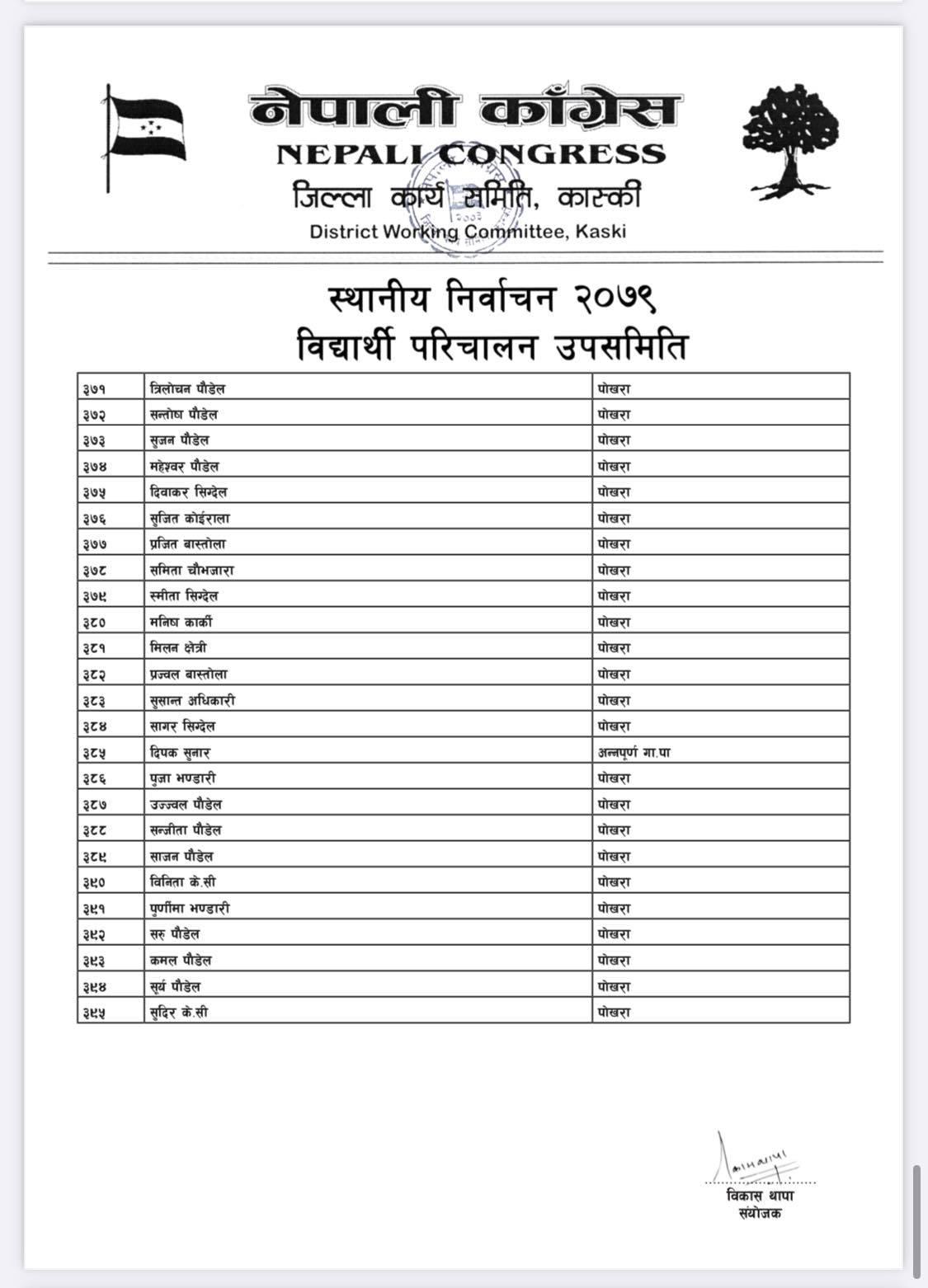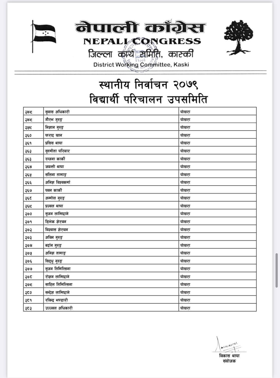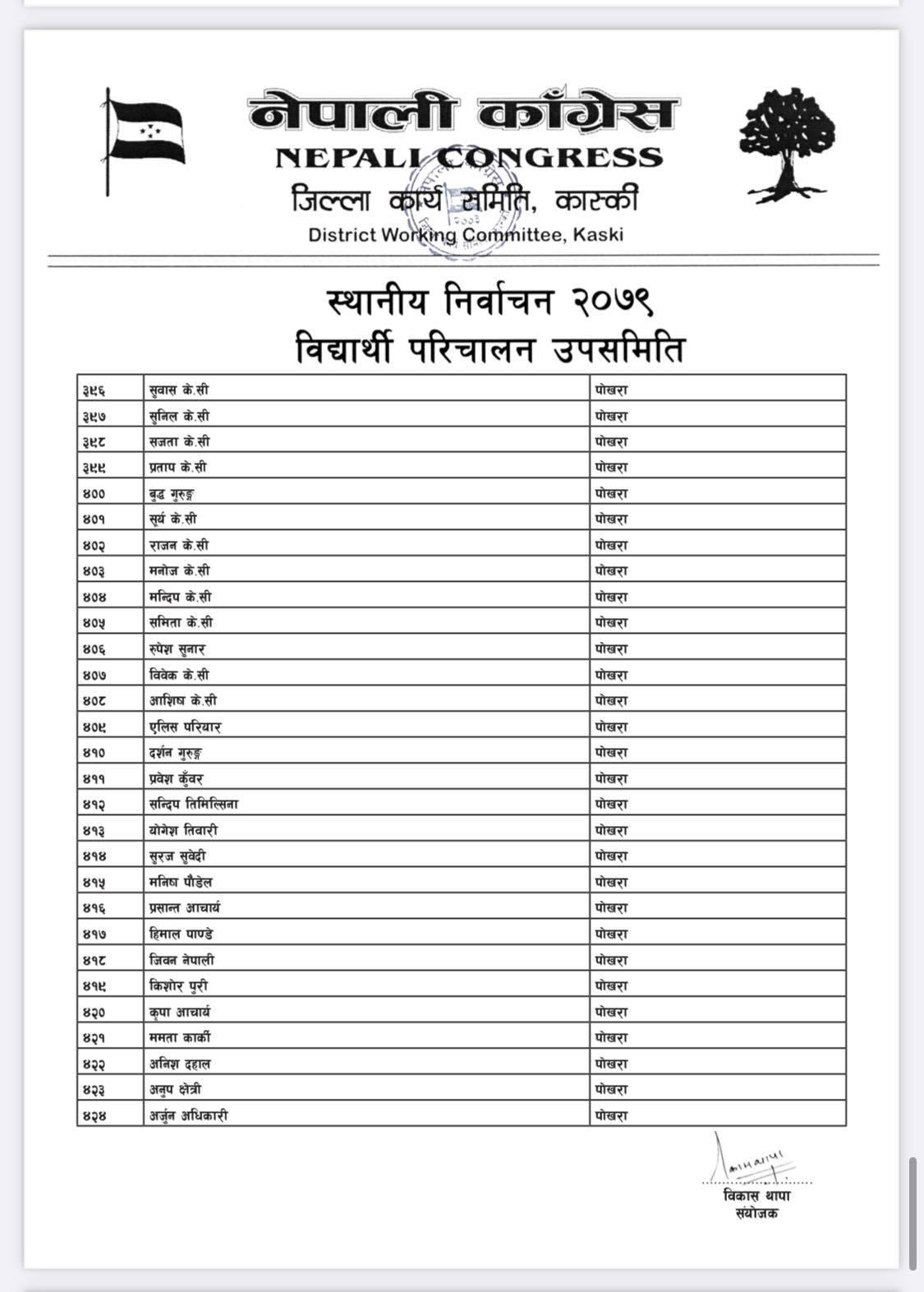 पोखरा/नेपाली काँग्रेसको बिद्यार्थी संगठन नेपाल विद्यार्थी संघले कास्कीको निर्वाचन हाँक्नका लागि ५०८ सदस्यीय निर्वाचन परिचालन समिति गठन गरेको बिद्यार्थी परिचालन समितिका संयोजक बिकास थापाले जानकारी दिए । थापाले नेपाली काँग्रेस र गठबन्धनका उम्मेदवारलाई निर्वाचनमा विजयी बनाउन परिचालन समिति गठन गरेको हो ।