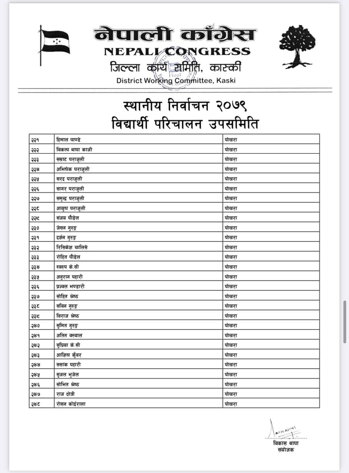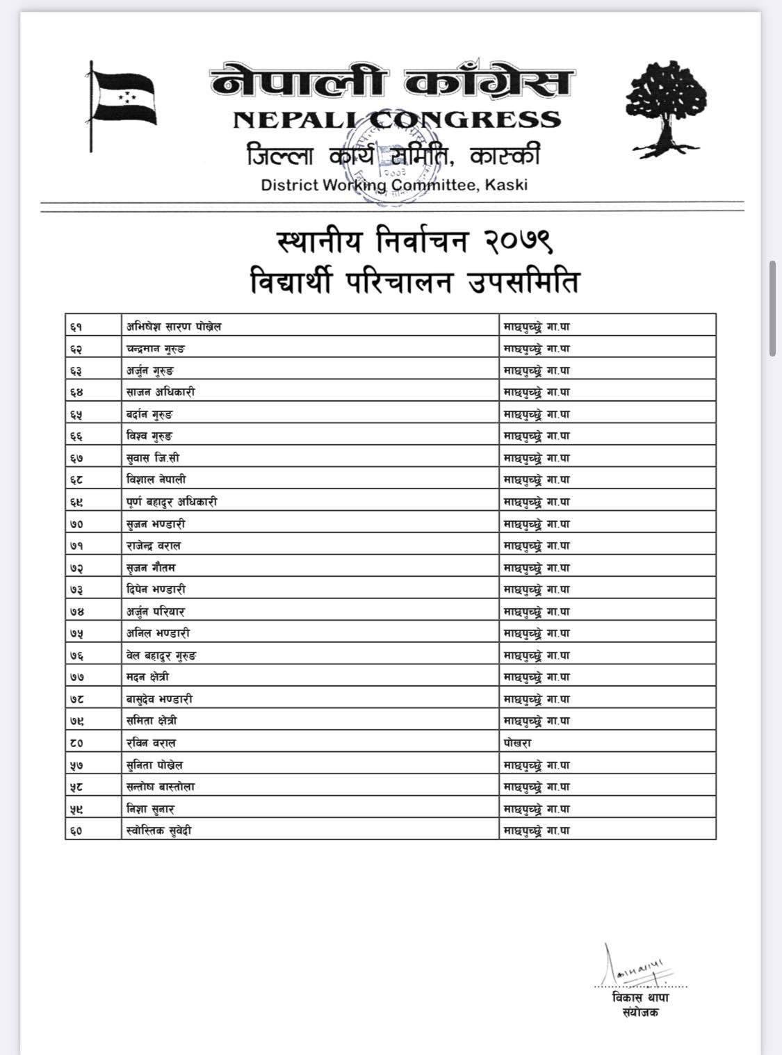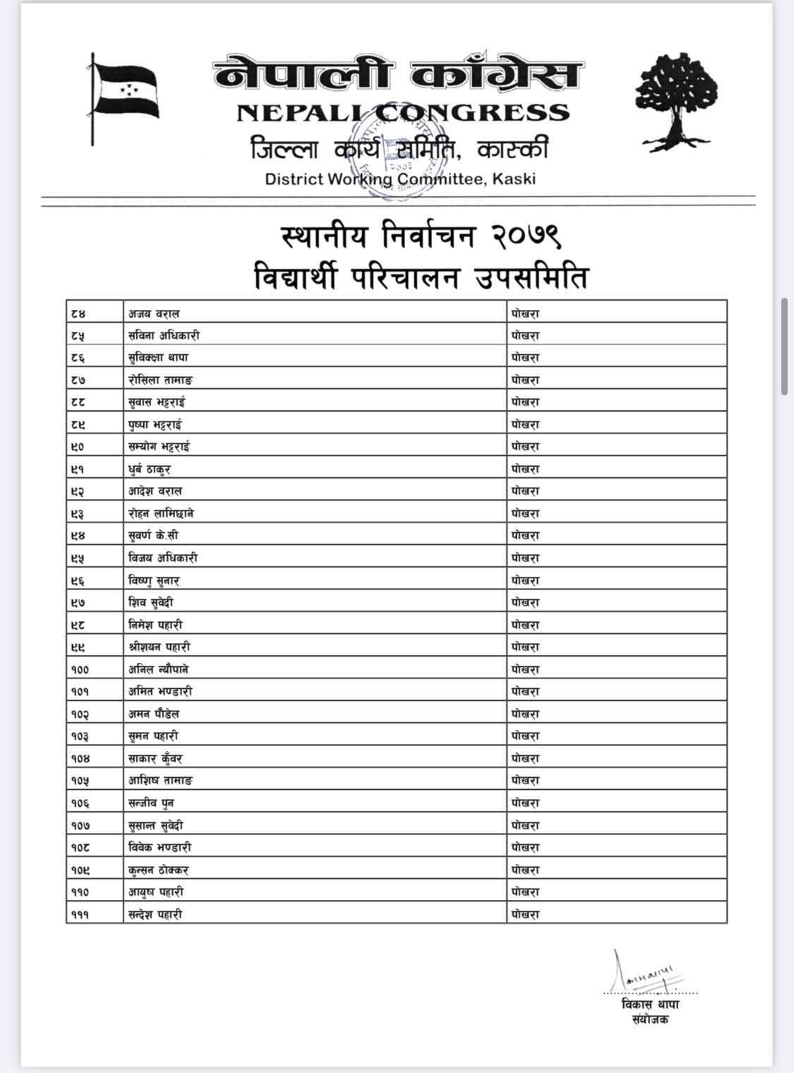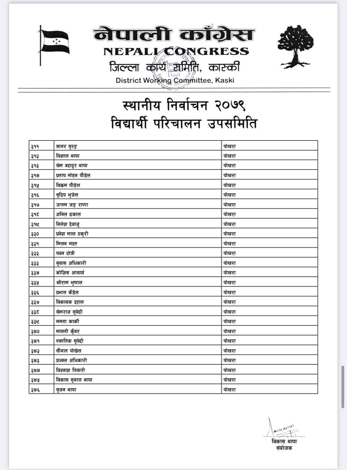 पोखरा/नेपाली काँग्रेसको बिद्यार्थी संगठन नेपाल विद्यार्थी संघले कास्कीको निर्वाचन हाँक्नका लागि ५०८ सदस्यीय निर्वाचन परिचालन समिति गठन गरेको बिद्यार्थी परिचालन समितिका संयोजक बिकास थापाले जानकारी दिए । थापाले नेपाली काँग्रेस र गठबन्धनका उम्मेदवारलाई निर्वाचनमा विजयी बनाउन परिचालन समिति गठन गरेको हो ।