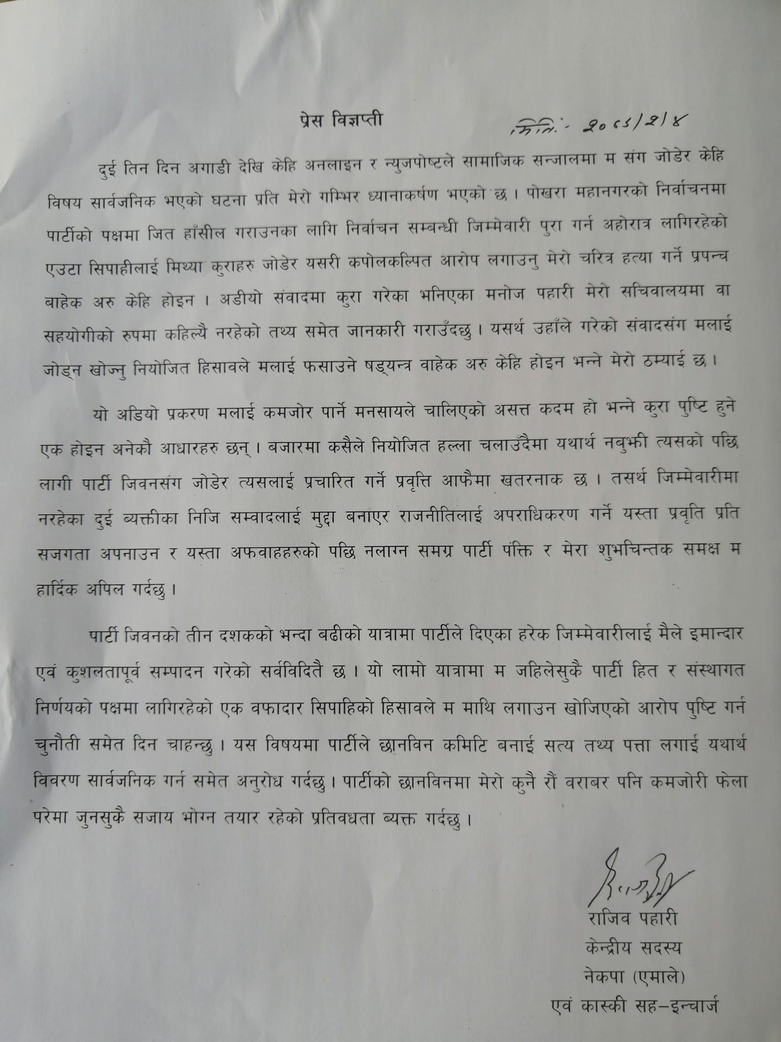 दुई तिन दिन अगाडी देखि केहि अनलाइन र न्युजपोष्टले सामाजिक सन्जालमा म संग जोडेर केहि विषय सार्वजनिक भएको घटना प्रति मेरो गम्भिर ध्यानाकर्षण भएको छ । पोखरा महानगरको निर्वाचनमा पार्टीको पक्षमा जित हाँसील गराउनका लागि निर्वाचन सम्बन्धी जिम्मेवारी पुरा गर्न अहोरात्र लागिरहेकोे एउटा सिपाहीलाई मिथ्या कुराहरु जोडेर यसरी कपोलकल्पित आरोप लगाउनु मेरो चरित्र हत्या गर्ने प्रपन्च बाहेक अरु केहि होइन । अडीयो संवादमा कुरा गरेका भनिएका मनोज पहारी मेरो सचिवालयमा वा सहयोगीको रुपमा कहिल्यै नरहेको तथ्य समेत जानकारी गराउँदछु । यसर्थ उहाँले गरेको संवादसंग मलाई जोड्न खोज्नु नियोजित हिसावले मलाई फसाउने षड्यन्त्र वाहेक अरु केहि होइन भन्ने मेरो ठम्याई छ ।