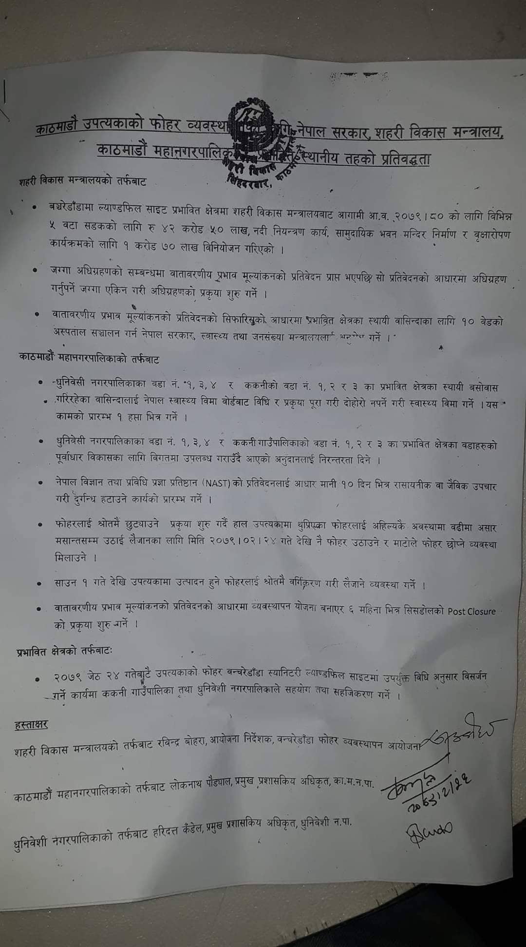 सहरी विकास मन्त्रालयका तर्फबाट तीन र ६ वटा कामको विवरणमा प्रतिवद्धता जनाएसँगै आन्दोरतपक्षले फोहर बिसर्जन गर्न दिने भएको हो ।