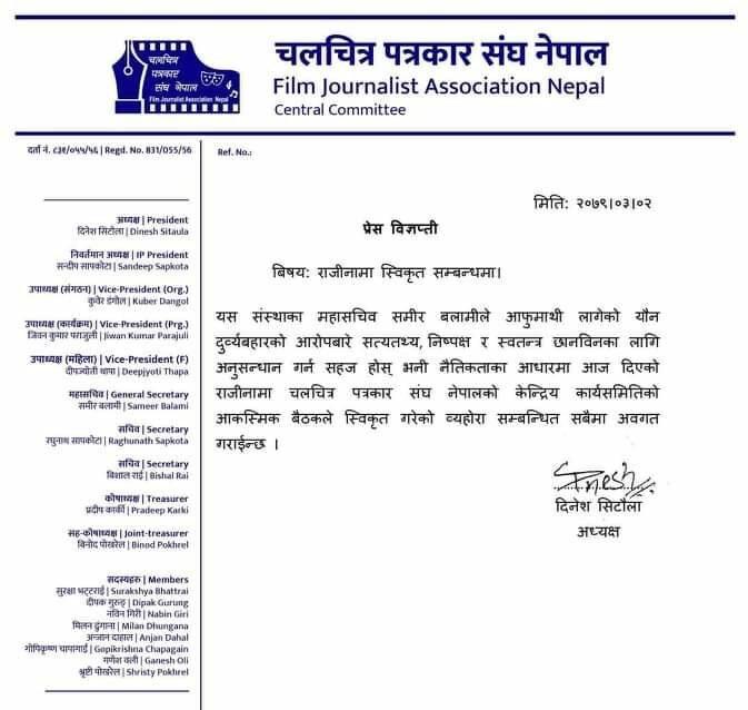 महिला पत्रकारमाथि यौन दुर्व्यवहारको आरोप लागेपछि बलामीले ‘अनुसन्धानका लागि सहज होस् भनेर राजीनामा दिएको चलचित्र पत्रकार संघलले जनाएको छ ।