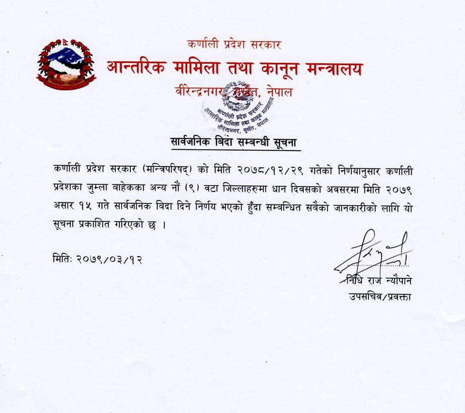 धान दिवसको अवसर पारेर कर्णाली मन्त्रिपरिषद्को बैठकले सार्वजनिक बिदा दिने निर्णय गरेको छ ।