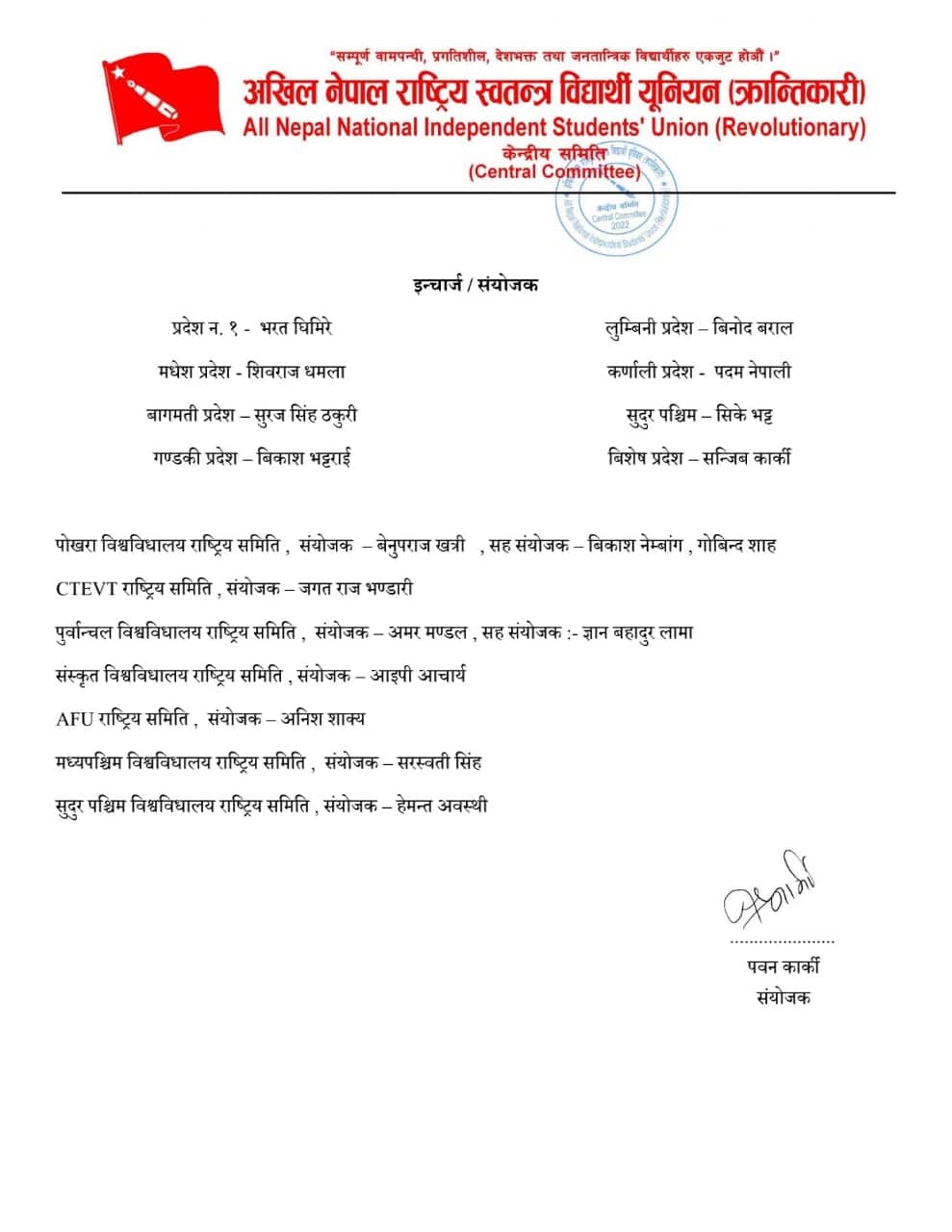 सो समुहले १ सय ९७ सदस्य केन्द्रिय आयोजक समिति गठन गर्दै प्रदेश १ मा भरत घिमिरे, मधेस प्रदेशमा शिवराज धमला, बाग्मती प्रदेशमा सुरजसिंह ठकुरी, गण्डकी प्रदेशमा विकास भट्टराई, लुम्विनी प्रदेशमा बिनोद बराल, कर्णाली प्रदेशमा पदम नेपाली, सुदुरपश्चिममा सिके भट्ट र बिशेष प्रदेशमा सञ्जिव कार्कीलाई इन्चार्ज- संयोजक तोकेको छ ।