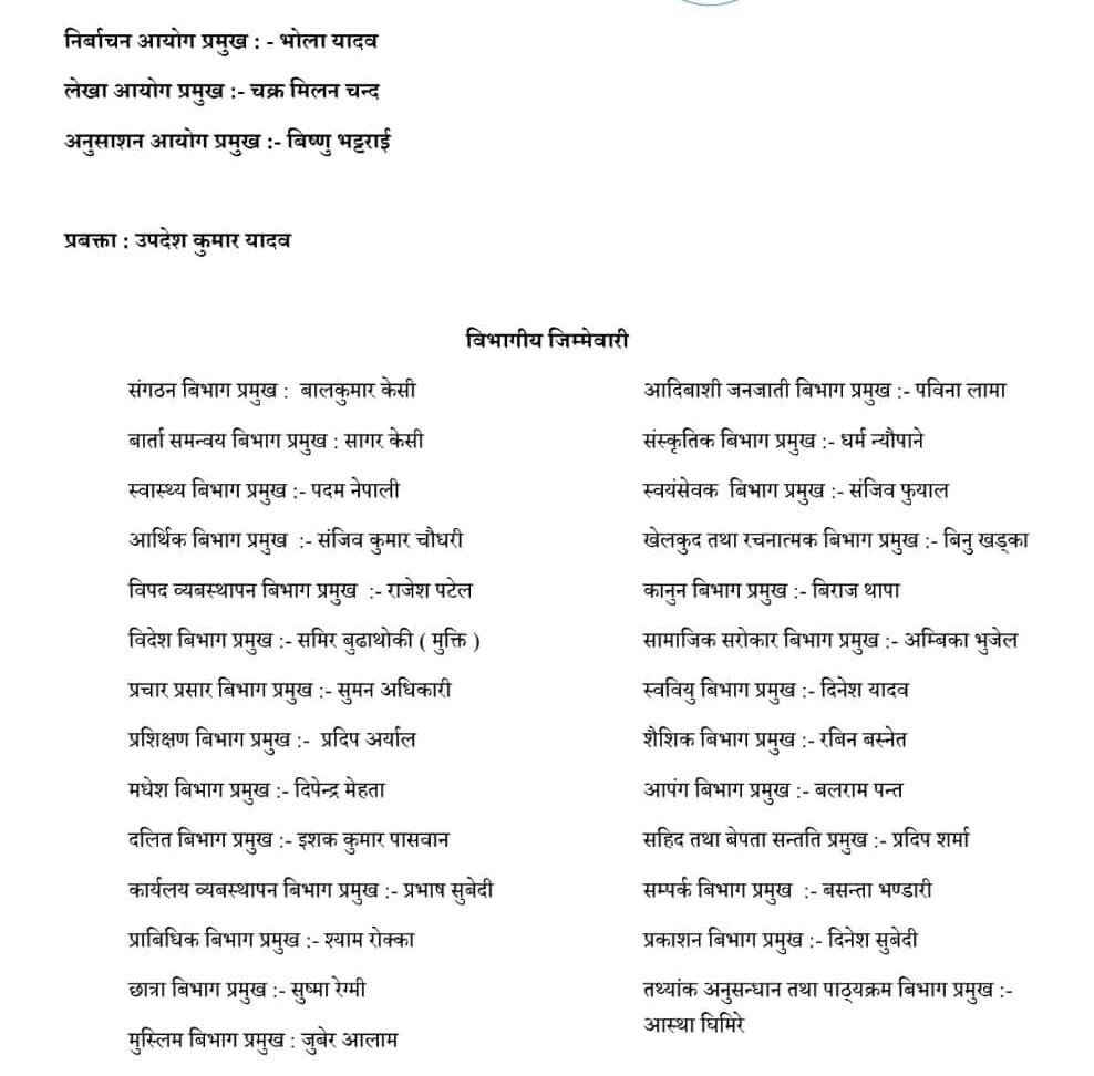 सो समुहका उपदेश यादवका अनुसार झन्डै २ दर्जन केन्द्रिय बिभागमा पनि इन्चार्ज र सह–इन्चार्ज तोकिएका छन । आगामी बैठकले राष्ट्रिय सम्मेलनको मिति तय गर्ने यादवले जानकारी दिएका छन ।