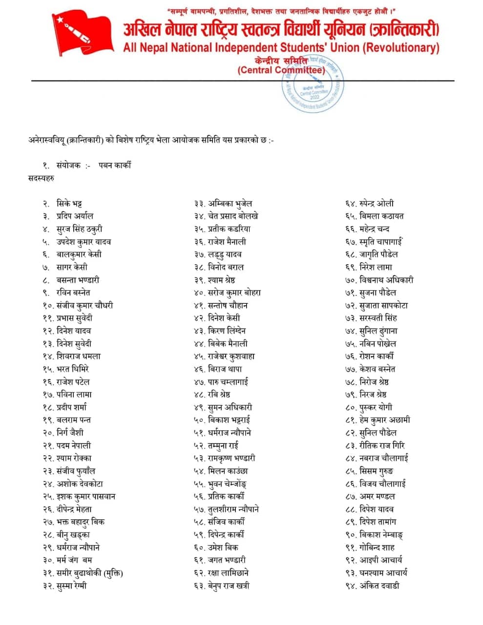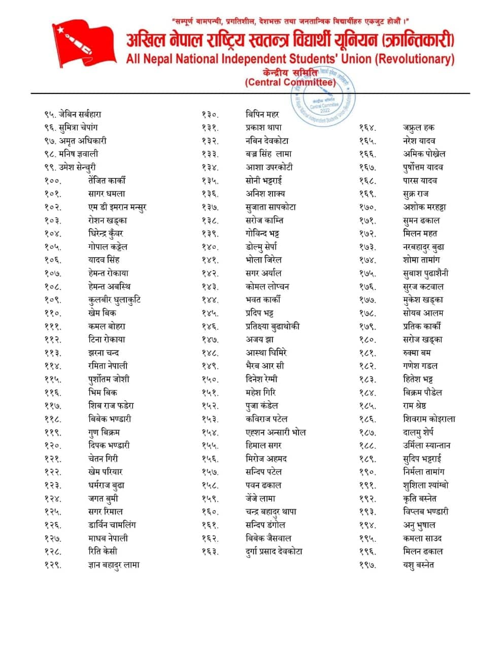 अखिल क्रान्तिकारीको समानान्तर समिति १ सय ९७ सदस्सीय (सुचीसहित)