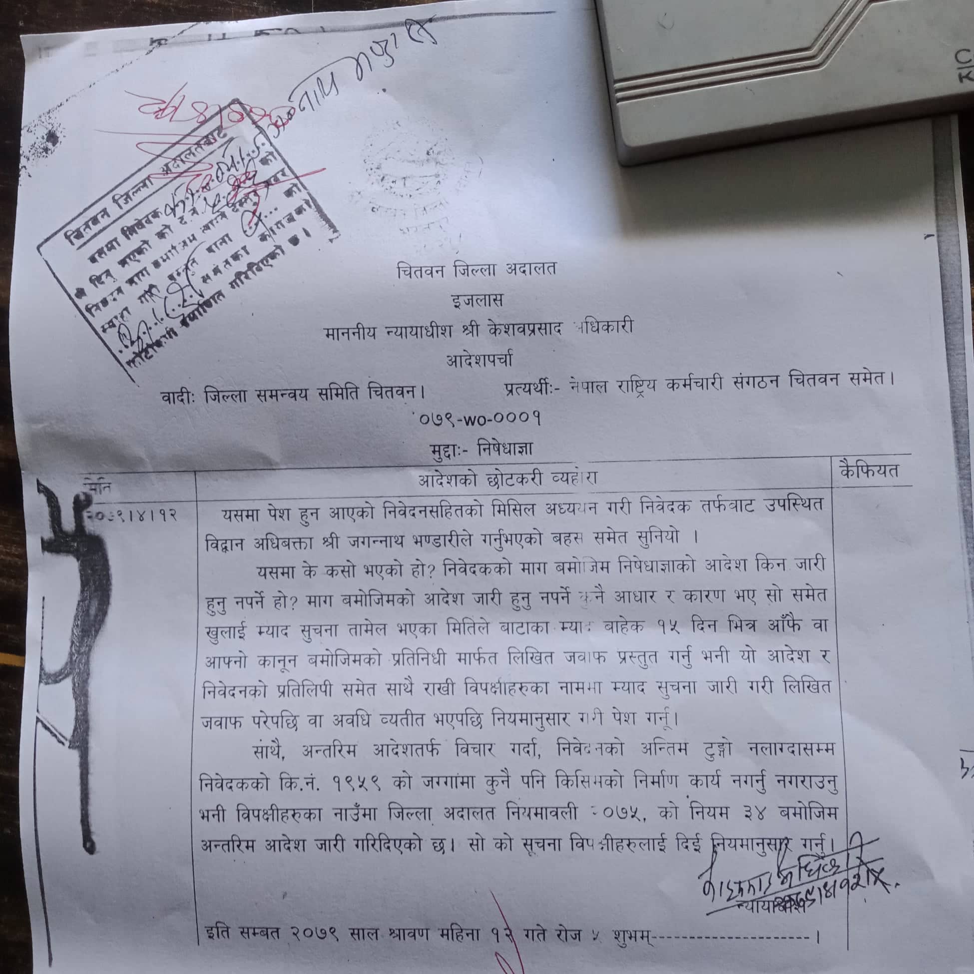 जिल्ला अदालतका न्यायाधीश केशवप्रसाद अधिकारीको एकल इजलासले बिहीबार उक्त जग्गामा कुनै पनि किसिमको निर्माण कार्य नगर्न नगराउन भनी विपक्षीका नाममा अन्तरिम आदेश जारी गरेको हो ।