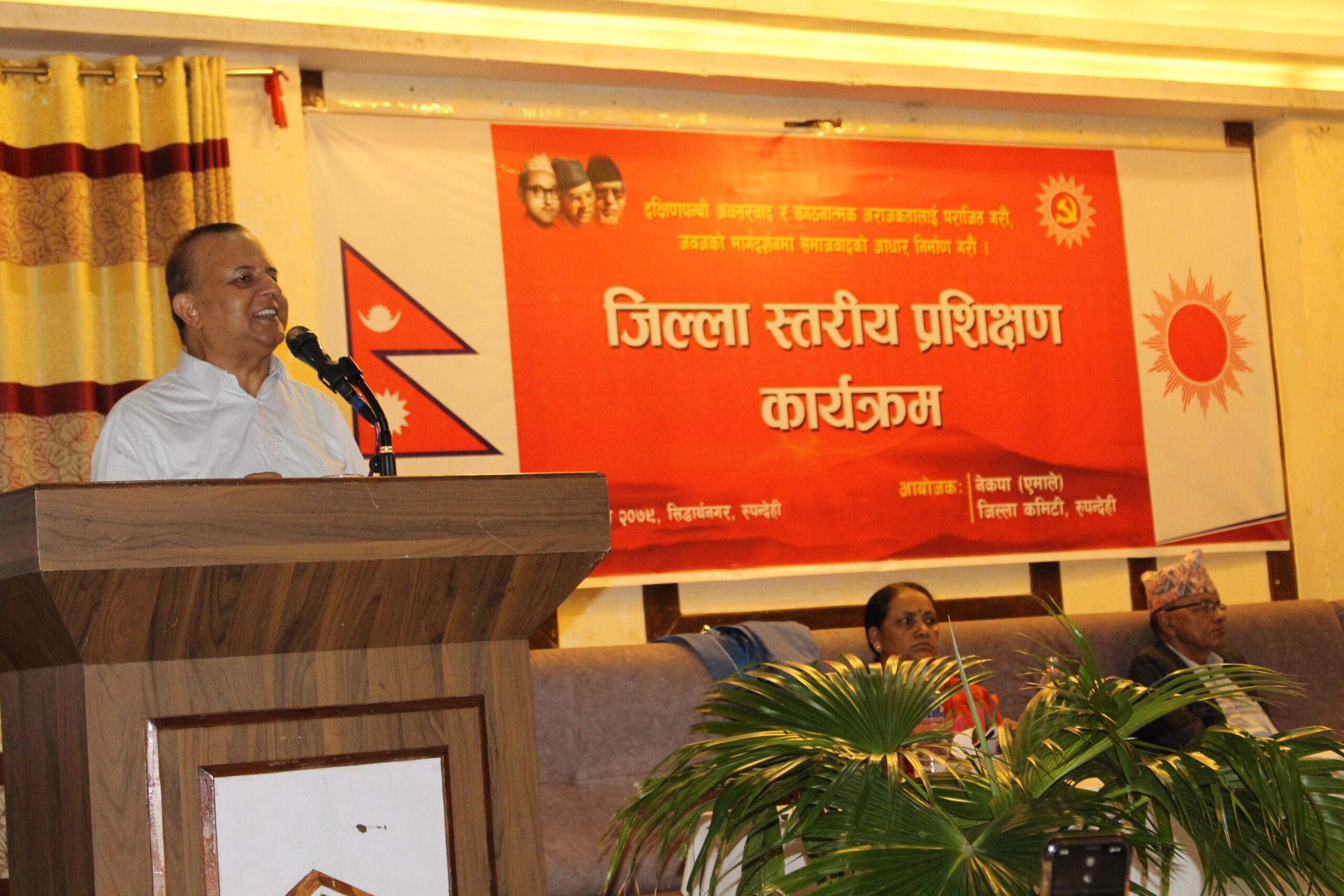 एमाले जिल्ला कमिटी रुपन्देहीले आइतबार भैरहवामा आयोजना गरेको जिल्लास्तरीय प्रशिक्षण कार्यक्रमलाई उनले माओवादी केन्द्र र एकीकृत समाजवादी विचार, गन्तव्य, लक्ष्यमा द्विविधा रहेको पार्टी भएको बताए । ‘माओवादी केन्द्र र एकीकृत समाजवादीलाई नेपाली कांग्रेसका सभापति शेरबहादुर देउवाको सहारामा हिँड्नुपर्ने बाध्यता छ,’ उनले भने । एमालेको मुख्य प्रतिस्पर्धा कांग्रेससँग नै रहेको उनले बताए । अब एमालेले पार्टी प्रवेश र ‘घर फर्क अभियान’ थाल्नुपर्ने उनको भनाइ छ ।