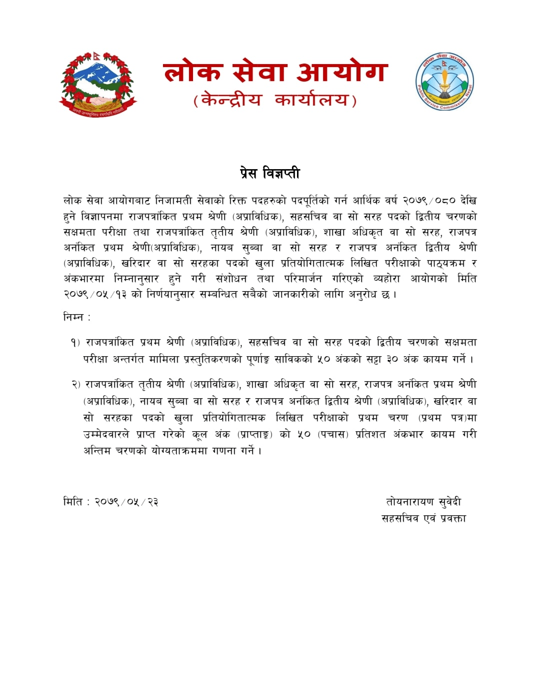 यस्तै, राजपत्रांकित तृतीय श्रेणी (अप्राविधिक), शाखा अधिकृत वा सो सरह, राजपत्र अनंकित प्रथम श्रेणी (अप्राविधिक), नायब सुब्बा वा सो सरह र राजपत्र अनंकित द्वितीय श्रेणी (अप्राविधिक), खरिदार वा सो सरहका पदको खुला प्रतियोगितात्मक लिखित परीक्षाको प्रथम चरण (प्रथम पत्र)मा उम्मेदवारले प्राप्त गरेको कूल अंक (प्राप्ताङ्क)को ५० (पचास) प्रतिशत अंकभार कायम गरी अन्तिम चरणको योग्यताक्रममा गणना गर्ने भएको छ ।