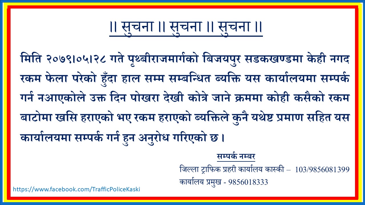 पोखरादेखि कोत्रे जाने क्रममा कोही कसैको रकम बाटोमा खसि हराएको भएमा रकम हराएको व्यक्तिले प्रमाणसहित जिल्ला ट्राफिक प्रहरी कार्यालय कास्कीमा सम्पर्क गर्न सूचना जारी गरिएको छ ।