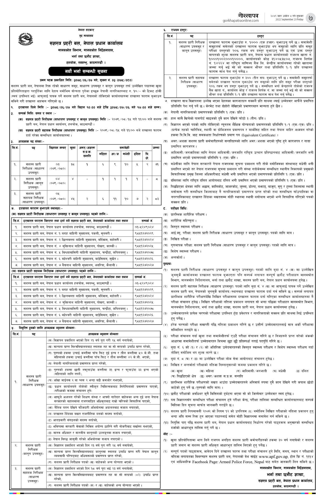 सशस्त्र प्रहरी बल, नेपालमा रिक्त रहेको साधारण समूह , साधारण उपसमूह र कानुन उपसमूह तर्फ खुला प्रतियोगिताद्वारा पदपूर्तिका गर्न आवेदन माग गरेको जनाएको छ । प्रहरीले कात्तिक ६ गतेसम्म आवेदन फारम भर्ने समय तोकेको छ ।