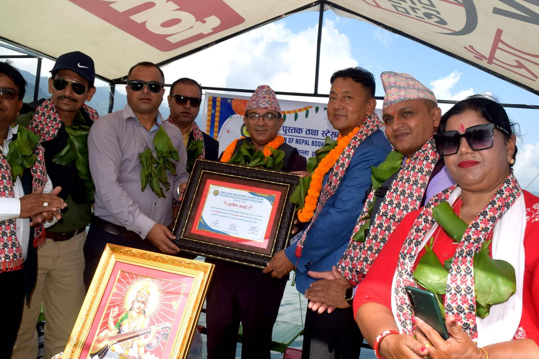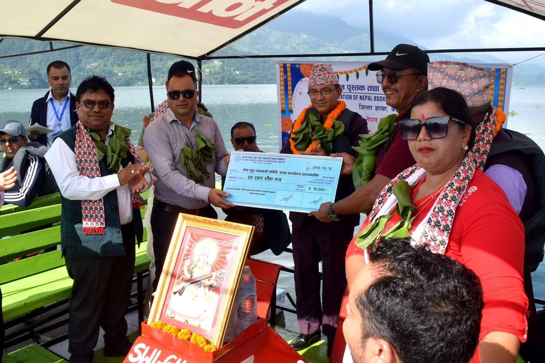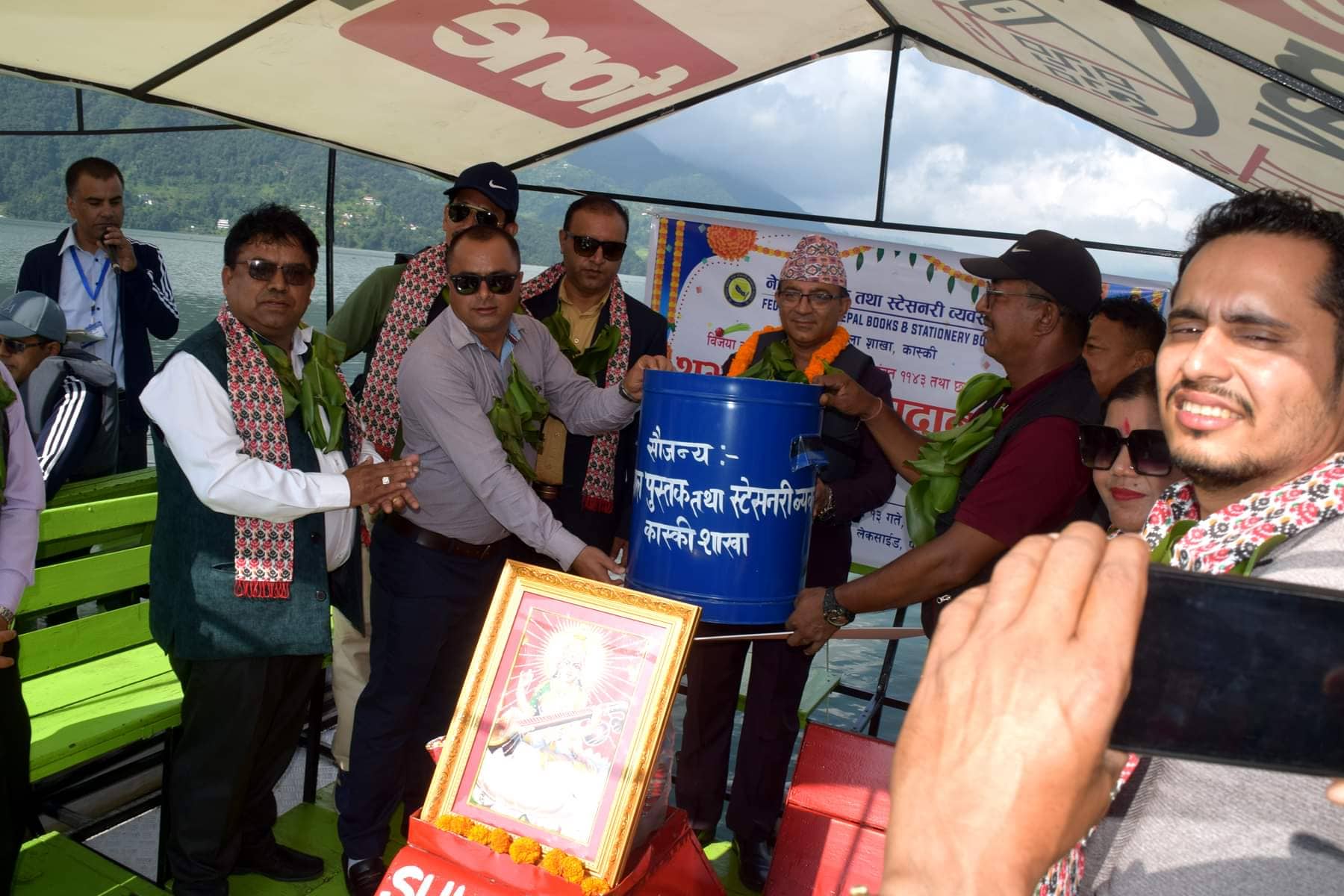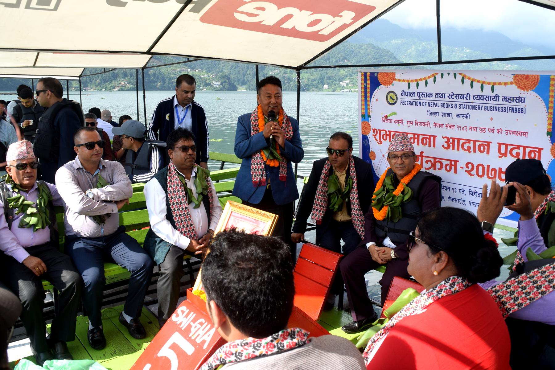 राजु गिरी, पोखरा । नेपाल पुस्तक तथा स्टेशनरी व्यवसायी महासंघ कास्कीले बिहीबार फेवातालको माथी डुङ्गामा शुभकामना आदान प्रदान तथा सम्मान कार्यक्रम गरेको छ । उक्त कार्यक्रमका प्रमुख अतिथि पोखरा महानगरपालिकाका मेयर धनराज आचार्यलाई जलकुम्भीको पातको माला लगाएर स्वागत गरिएको छ ।
