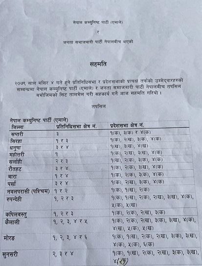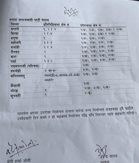सहमतिअनुसार यी जिल्लामा प्रतिनिधिसभाका ३५ सिट एमालेले लिनेछ भने जसपाले १७ सिट लिने भएको छ । तालमेल सहमतिपत्रमा एमाले अध्यक्ष केपी शर्मा ओली र जसपाका अध्यक्ष उपेन्द्र यादवले हस्ताक्षर गरेका छन् ।